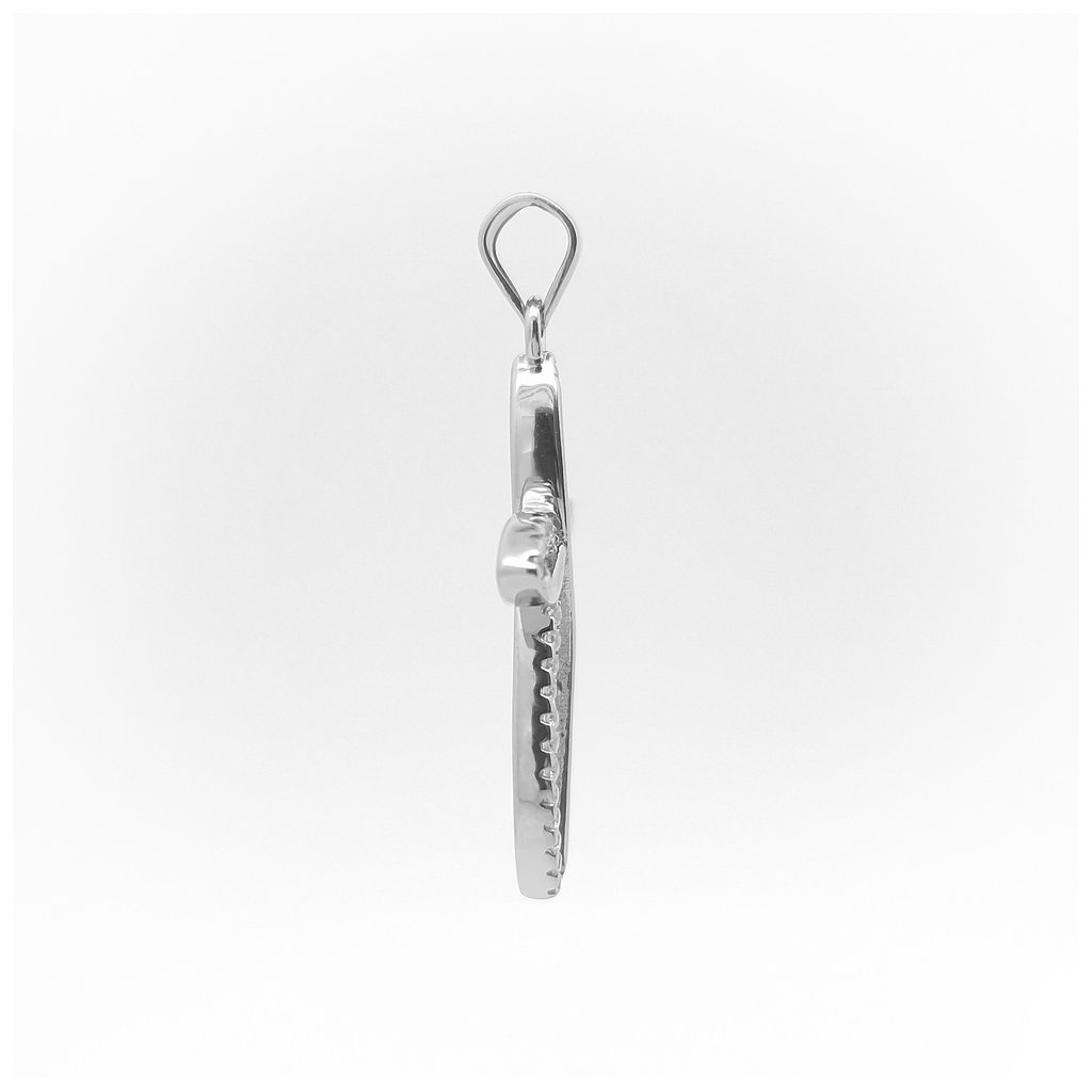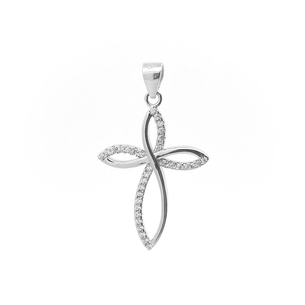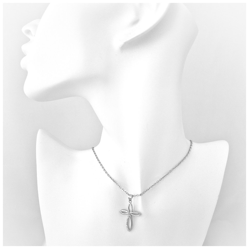 Kamienkový strieborný prívesok ,,krížik" s bielymi zirkónmi. Rozmer prívesku je 20x25mm. Rozmer závesného uška je 5x4mm. Prívesok má povrchovú úpravu rodium.