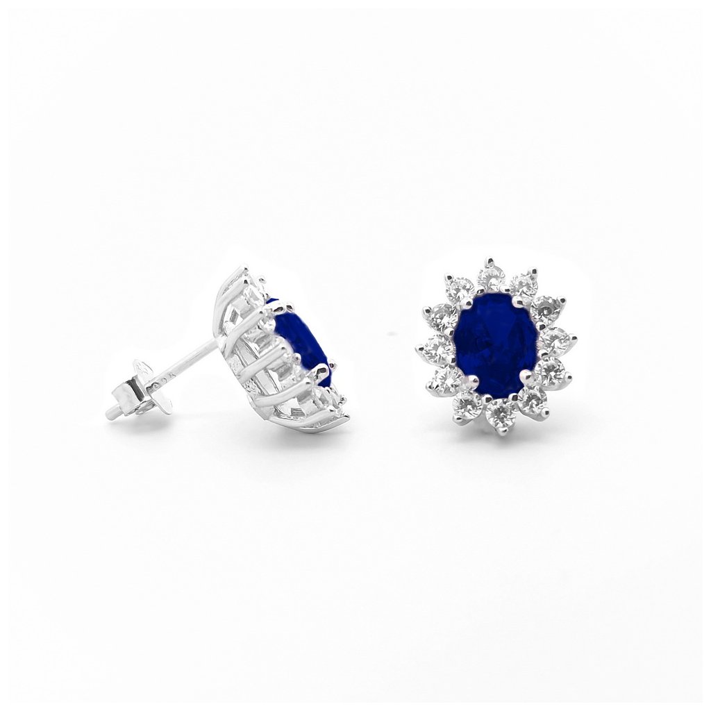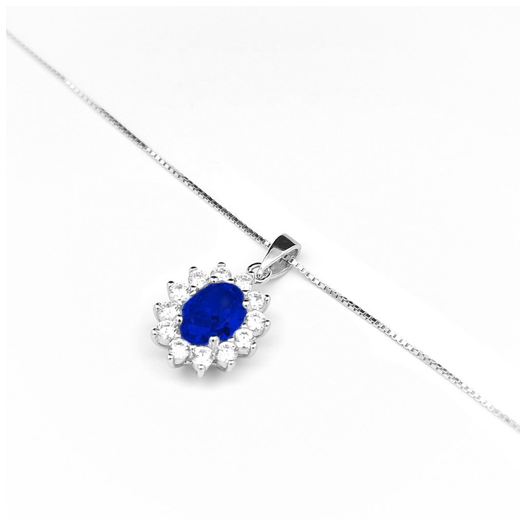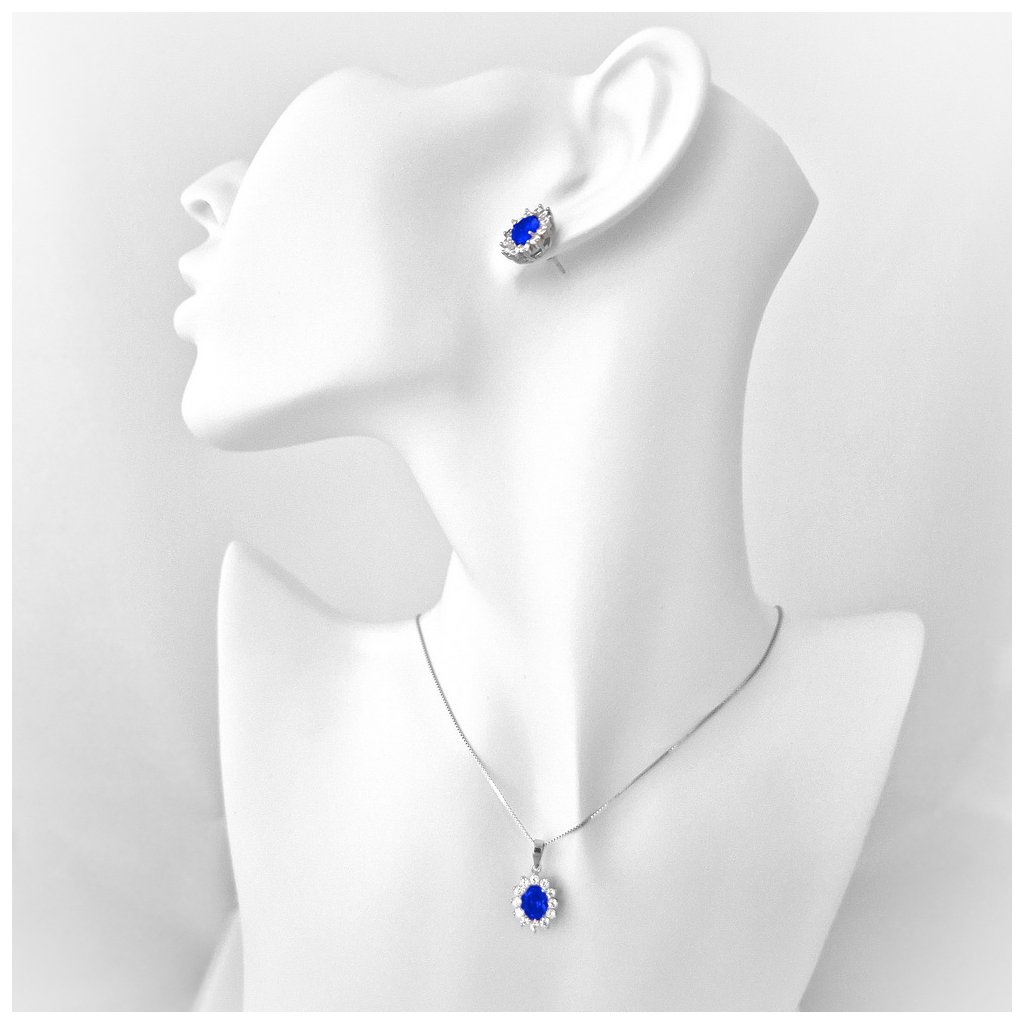 Strieborná bohato zdobená súprava so zirkónmi. Súprava sa skladá z náušníc so zapínaním na puzetku a retiazky s príveskom. Retiazka má dĺžku 42cm, rozmery príveska a náušníc sú rovnaké, centrálny kameň - tmavo modrej farby má rozmer 8x6mm, dookola je zdobený drobnými zirkónmi bielej farby. Celkový rozmer ozdoby je 12x14mm. Zapínanie na retiazke je na perový krúžok. Súprava má povrchovú úpravu rodium.
