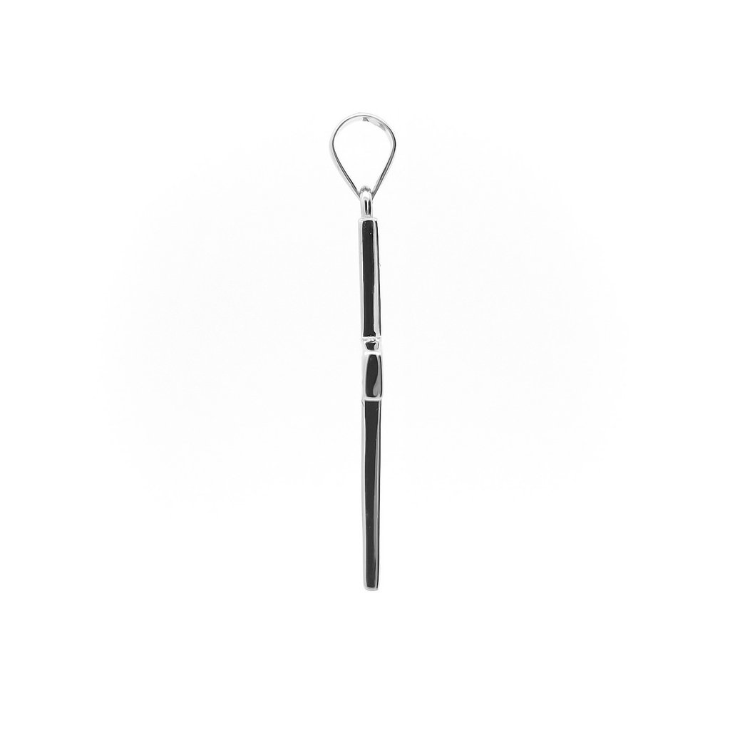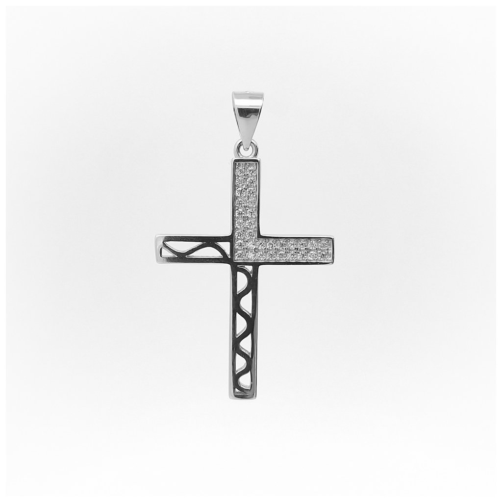 Hrubší kamienkový strieborný prívesok ,,krížik" s bielymi zirkónmi. Rozmer prívesku je 30x20mm a hrúbka je 4mm. Rozmer závesného uška je 5x4mm. Prívesok má povrchovú úpravu rodium.