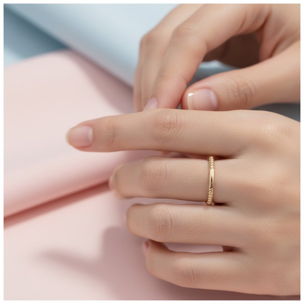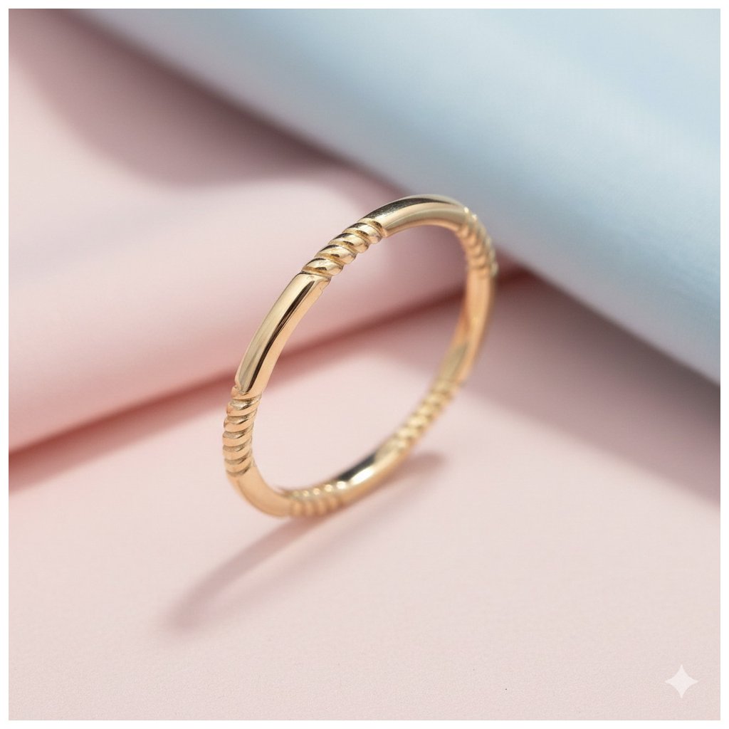 Jednoduchý prsteň zo žltého zlata bez kamienkov. Prsteň je v tvare obrúčky, po celom obvode mierne zdobená šrafovaním. šírka je cca 1,50mm. Obsahuje od 1,05 g, 14k zlata.