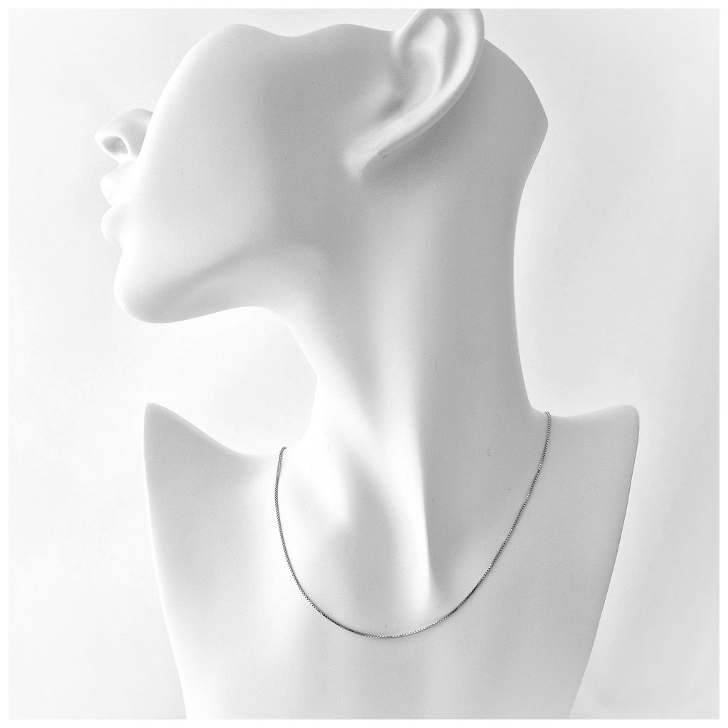 Strieborná retiazka vzor BOX. Šírka retiazky je 1,00 mm. Jedná sa o jemnú retiazku, vhodnú na zavesenie prívesku. Povrchová úprava: ródium. Zapínanie je na perový krúžok.