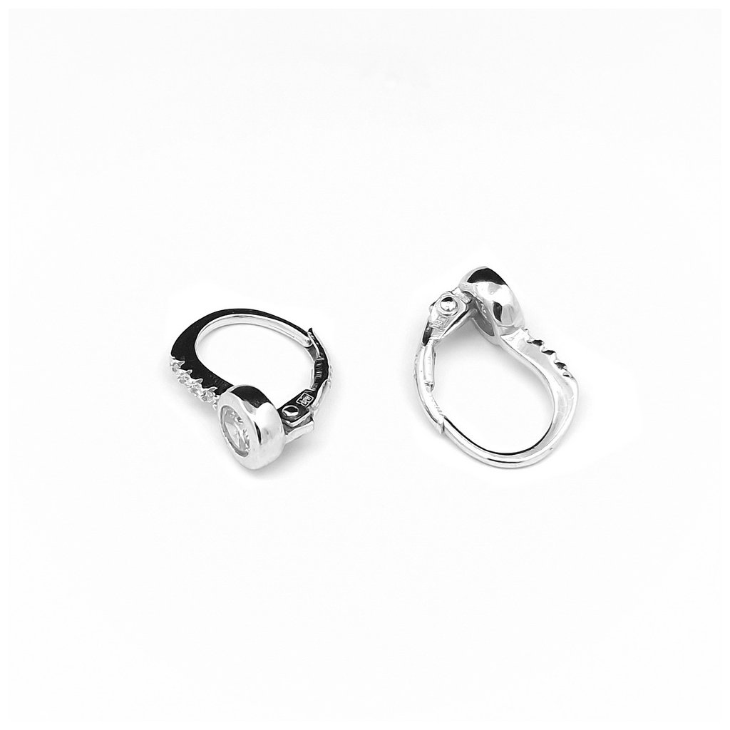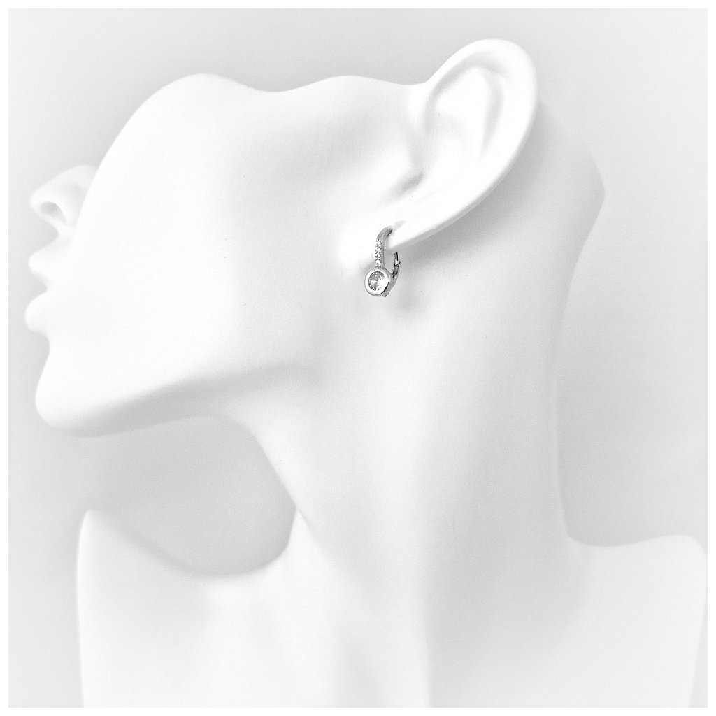 Strieborné náušnice zdobené zirkónmi. Centrálny kameň je v jemnej obrube, priemer kameňa je 3mm a priemer ozdoby je 5mm. Nožička je tiež zdobená zirkónmi. Zapínanie je na patent. Náušnice majú povrchovú úpravu rodium.