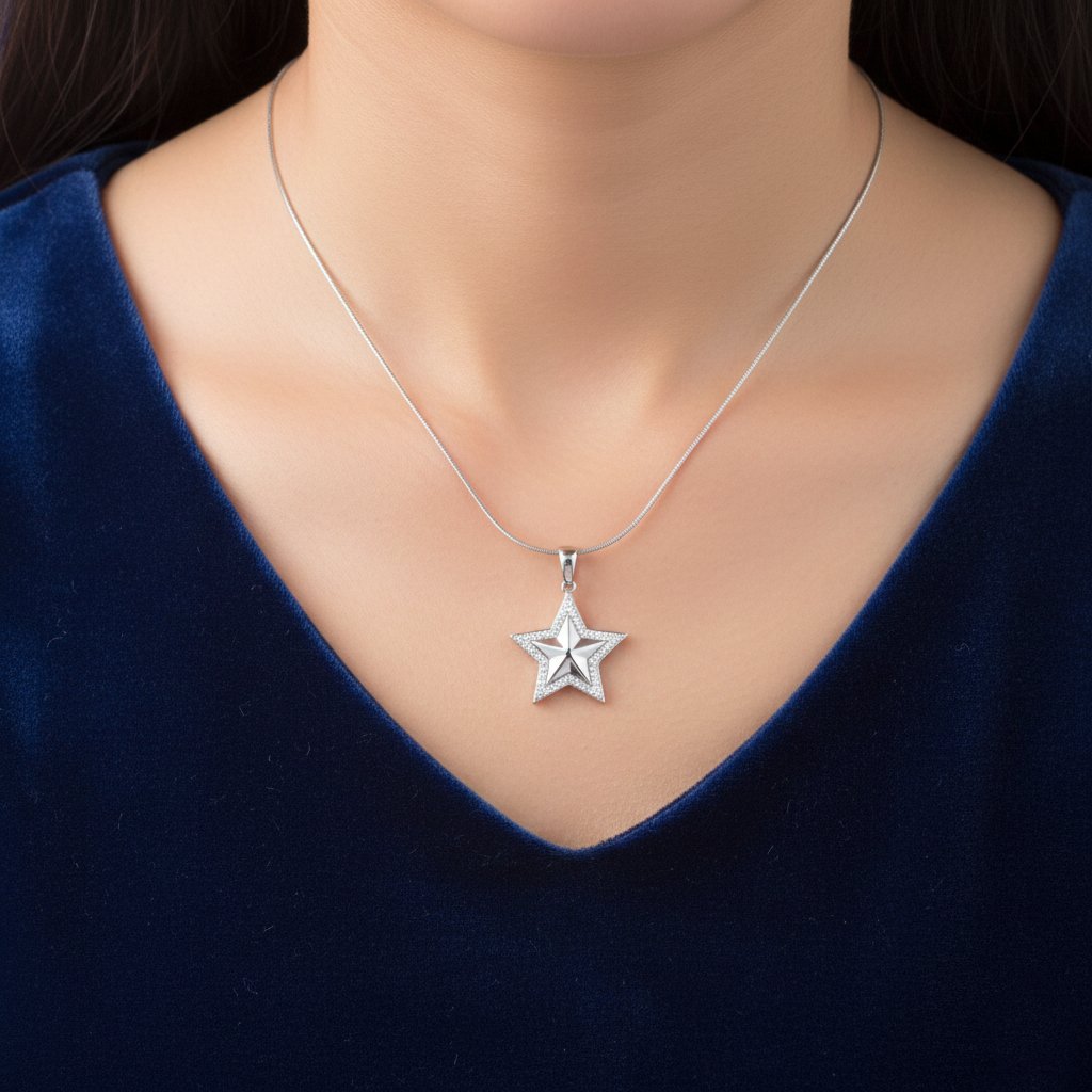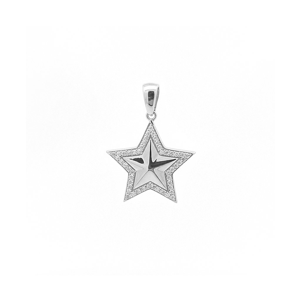 Kamienkový strieborný prívesok ,,hviezda" s bielymi zirkónmi. Priemer prívesku je 20mm. Rozmer závesného uška je 5x4mm. Prívesok má povrchovú úpravu rodium.
