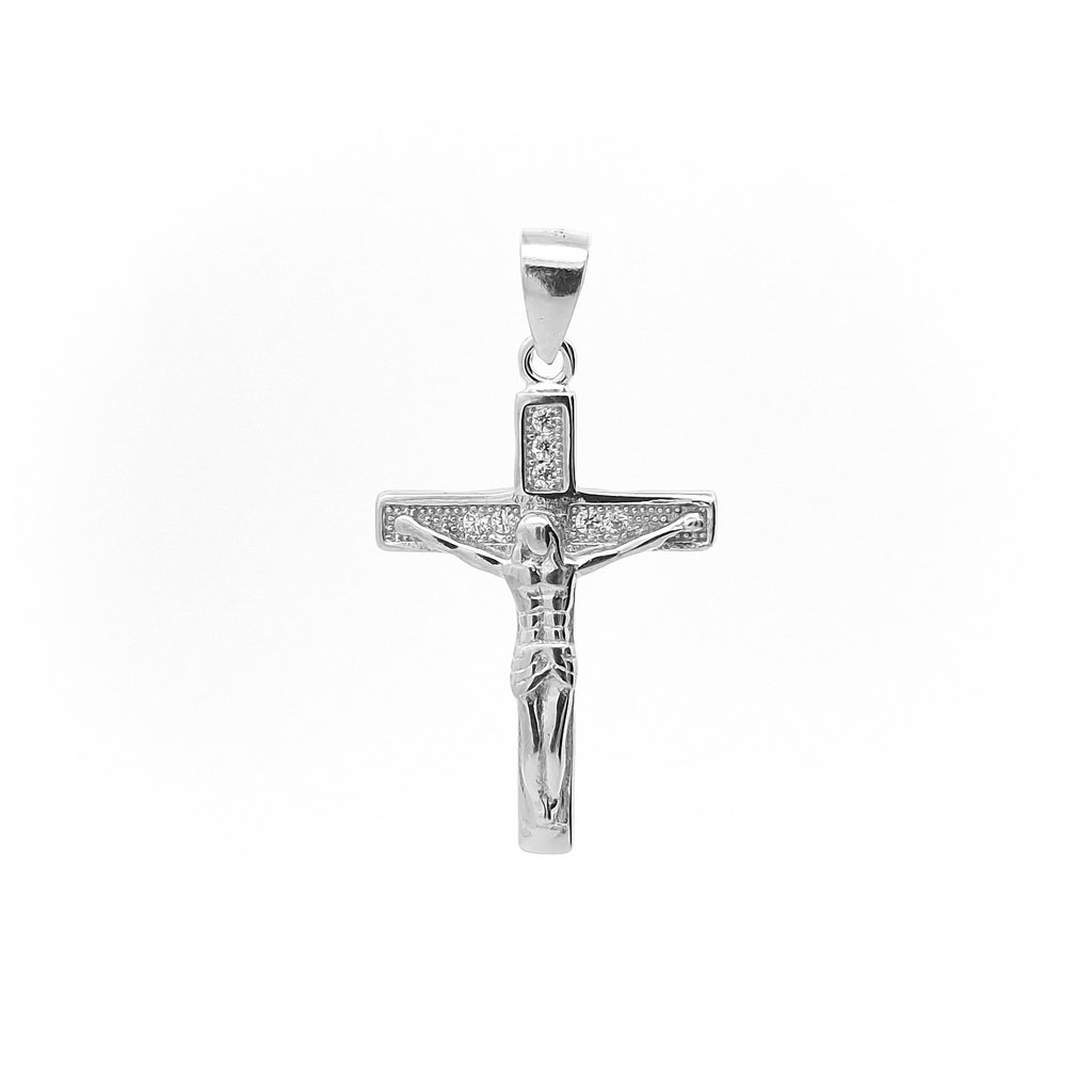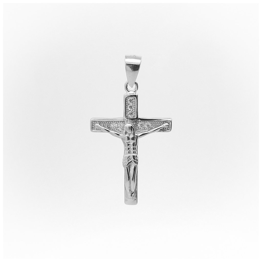 Kamienkový strieborný prívesok ,,kríž s Kristom" s bielymi zirkónmi. Rozmer prívesku je 15x20mm. Rozmer závesného uška je 5x4mm. Prívesok má povrchovú úpravu rodium.