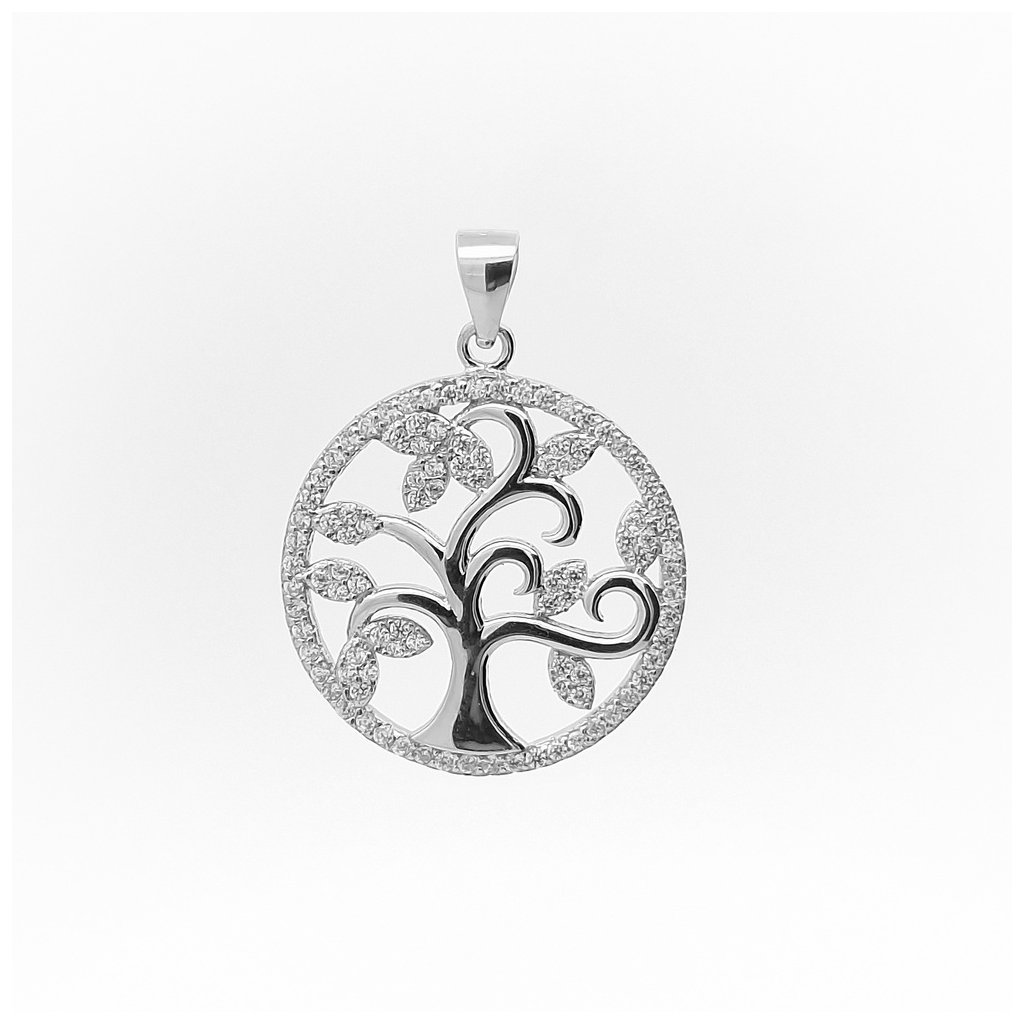 Kamienkový strieborný prívesok ,,strom života" s bielymi zirkónmi. Priemer prívesku je 20mm. Rozmer závesného uška je 5x4mm. Prívesok má povrchovú úpravu rodium.