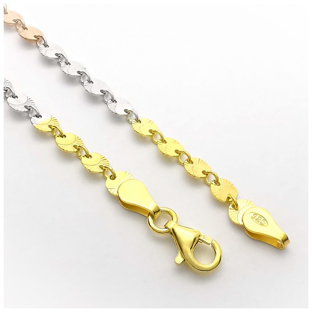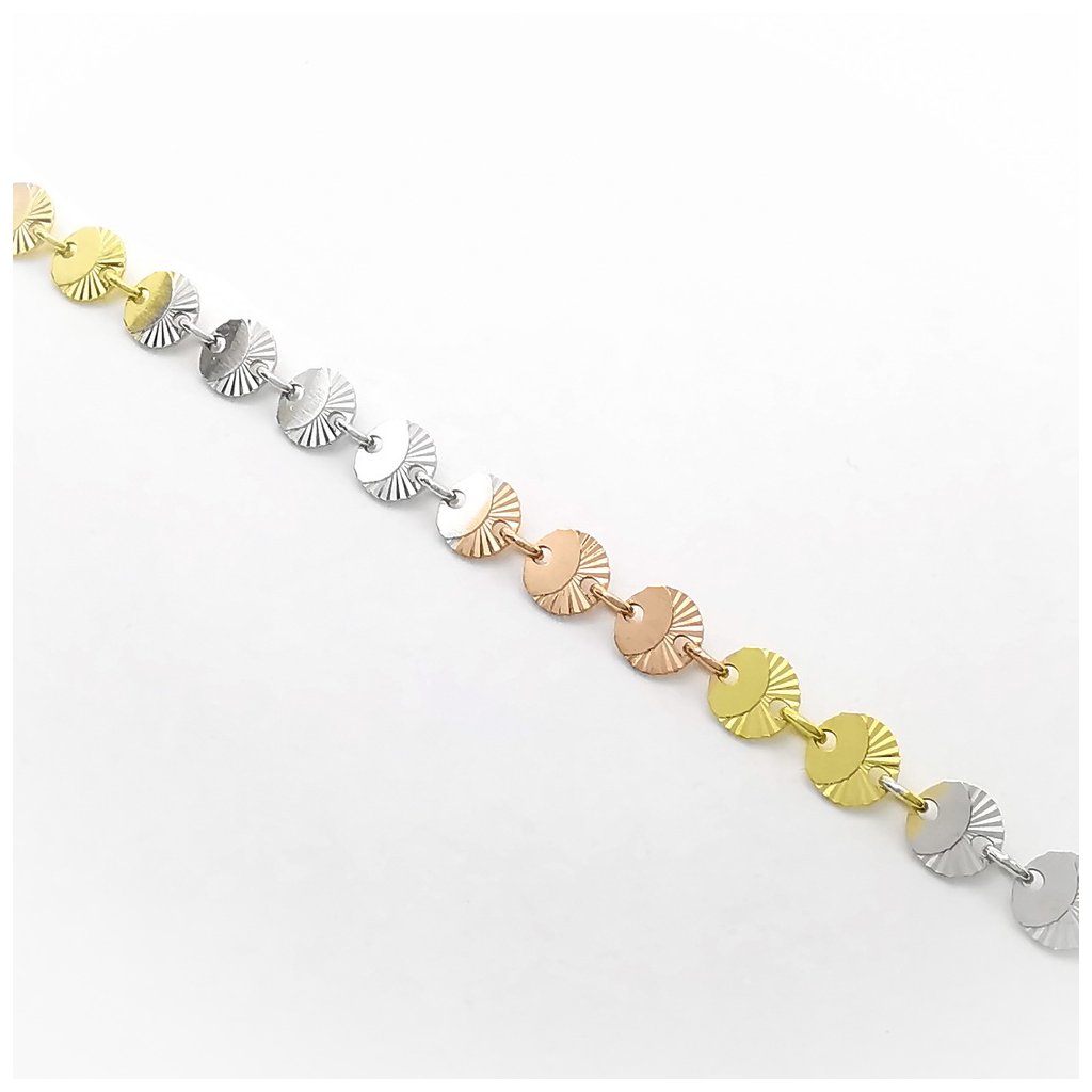 Dámsky kombinovaný strieborný náramok - tvoria ho platničky. Platničky sú v tvare kruhu s priemerom 4,00 mm a sú mierne gravírované. Zapínanie je na krabinku. Tento model má žlto-ružovú povrchovú úpravu spolu s rodiom.