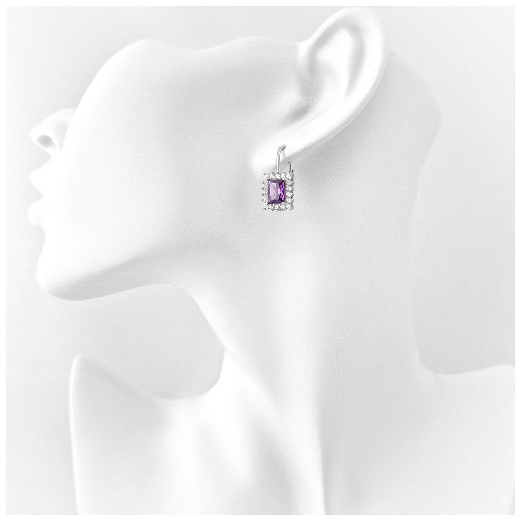 Strieborné náušnice s fialovým kameňom, sú elegantné a výnimočné. Náušnice majú centrálny kameň fialovej farby, rozmer kameňa je 5x7mm, po bokoch je zdobený bielymi zirkónmi. Rozmer ozdoby je 8x10mm. Zapínanie je na patent. Náušnice majú povrchovú úpravu rodium.