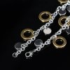 Dámsky oceľový náramok s príveskami. Prívesky majú tvar krúžku a peniazku. Krúžky sú pozlátené o priemere 14mm, šírka 2,5mm. Peniazky sú lesklé o priemere 8mm. Dĺžka 22cm. Zapínanie na karabínku.