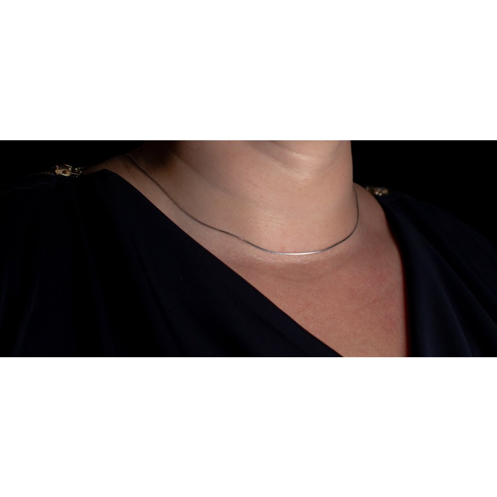 Dámska strieborná retiazka. Vzor hranatý hadík rodiovaný. Priemer 1,00 mm. Zapínanie je na karabinku.