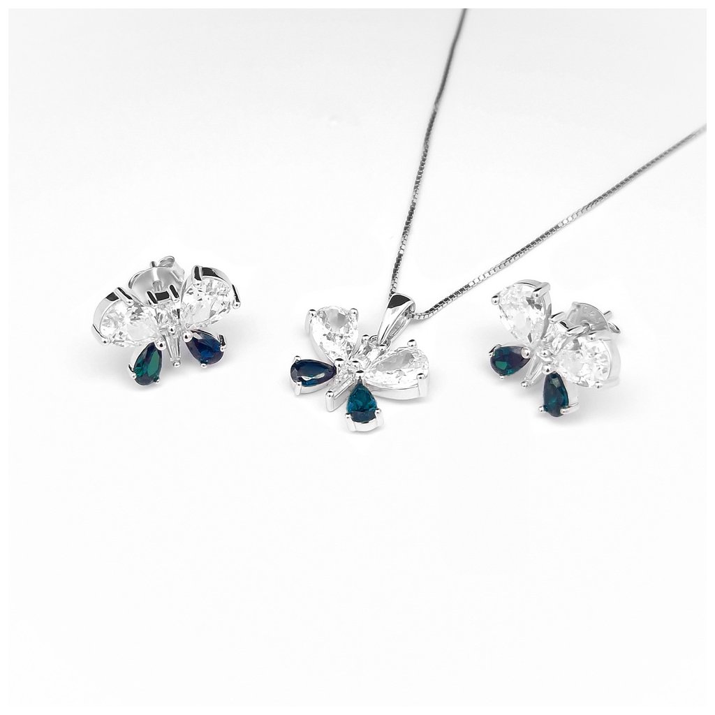 Strieborná bohato zdobená súprava so zirkónmi. Súprava sa skladá z náušníc so zapínaním na puzetku a retiazky s príveskom. Retiazka má dĺžku 42cm, rozmery príveska a náušníc sú rovnaké. Set je zdobený bielymi a tmavo modrými zirkónmi do tvaru motýľa. Celkový rozmer ozdoby na náušniciach a na prívesku je 15x10mm. Zapínanie na retiazke je na perový krúžok. Súprava má povrchovú úpravu rodium.