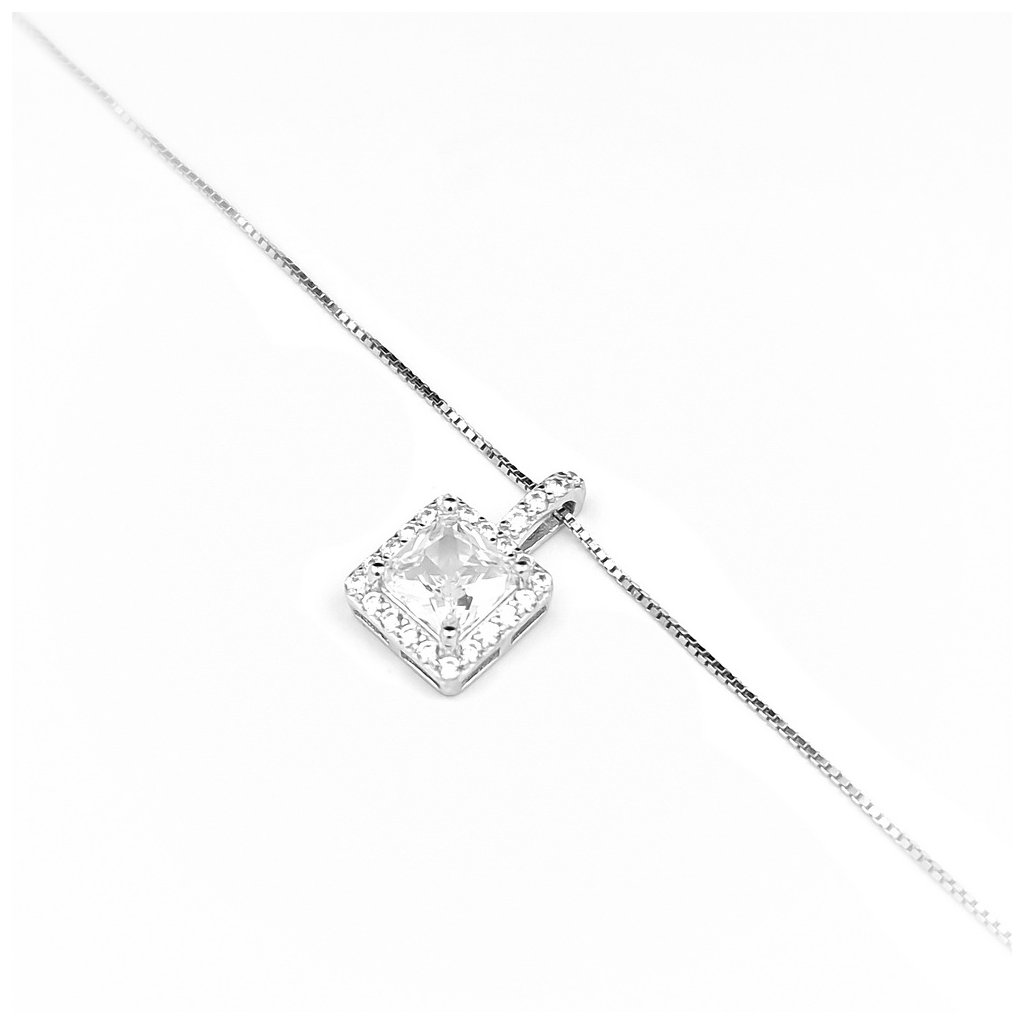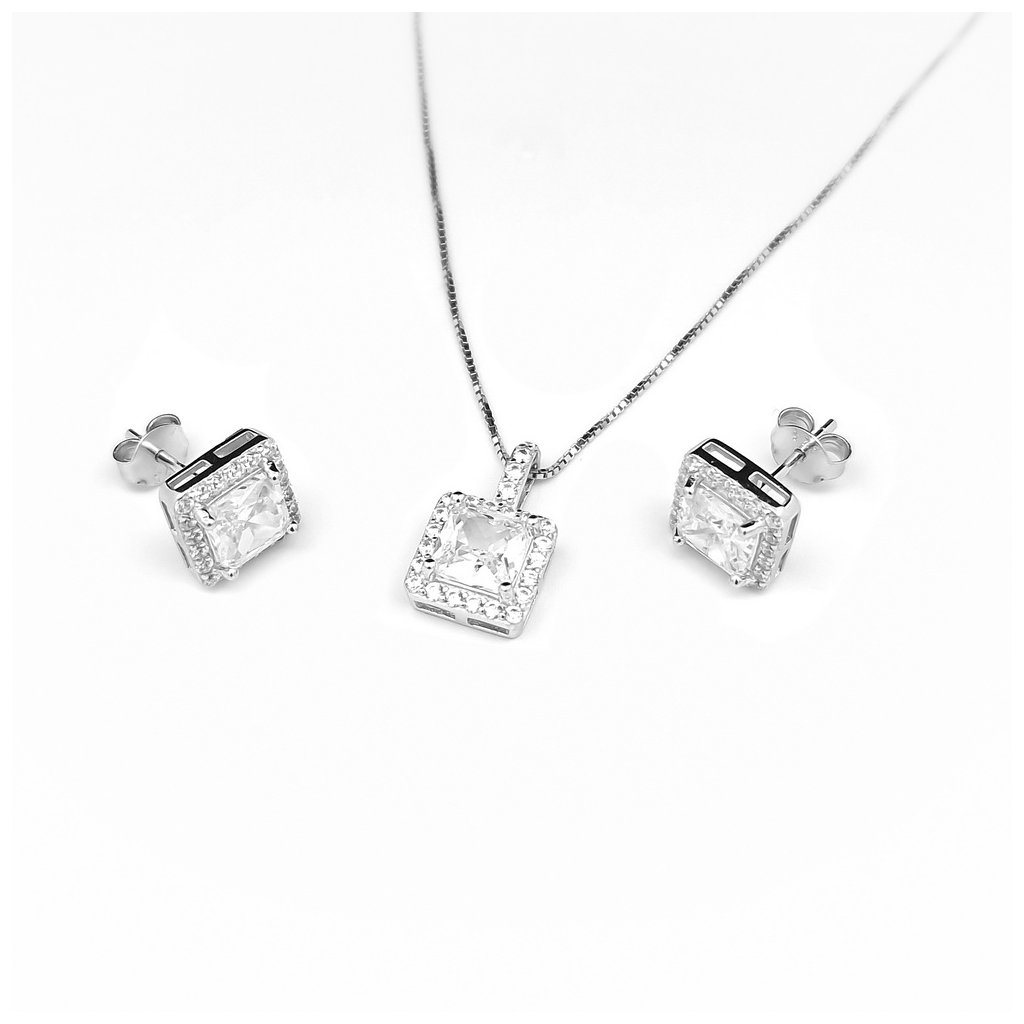 Strieborná bohato zdobená súprava so zirkónmi. Súprava sa skladá z náušníc so zapínaním na puzetku a retiazky s príveskom. Retiazka má dĺžku 42cm, rozmery príveska a náušníc sú rovnaké, centrálny kameň v tvare štvorca - bielej farby má rozmer 6x6mm, dookola je zdobený drobnými zirkónmi bielej farby. Celkový rozmer ozdoby je 7x7mm. Zapínanie na retiazke je na perový krúžok. Súprava má povrchovú úpravu rodium.