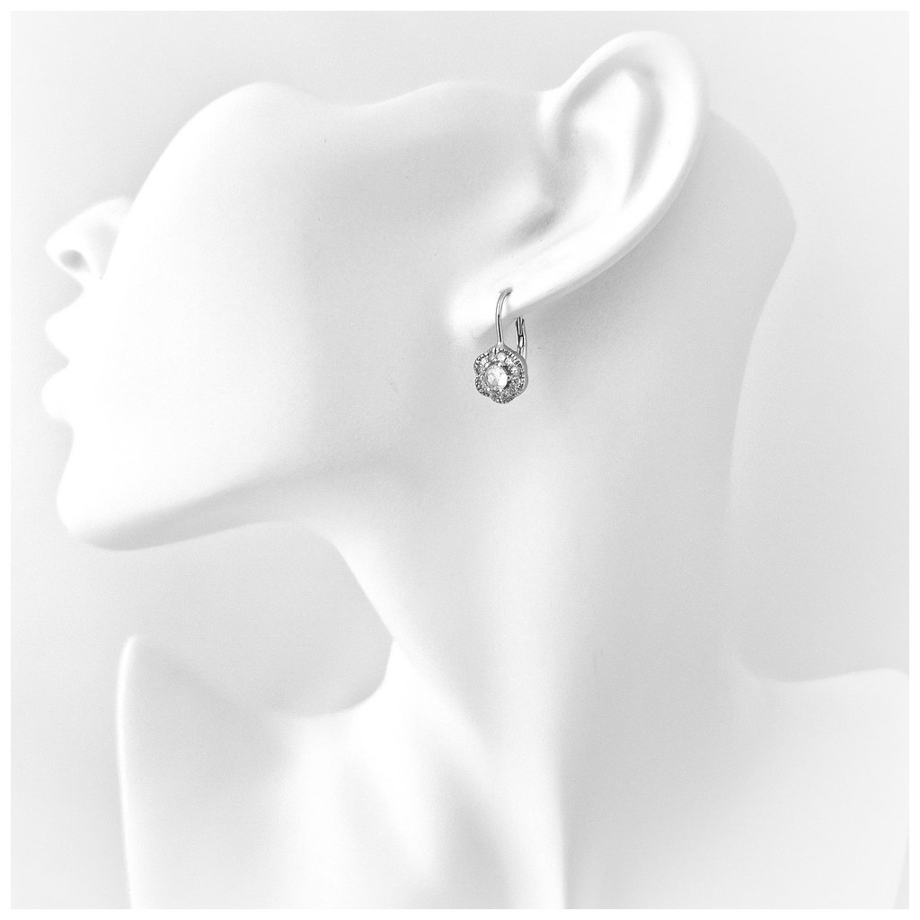 Strieborné bohato zdobené kamienkové náušnice, náušnice majú centrálny kameň o priemere 4mm osadený v krapniach, po bokoch je zdobený bielymi zirkónmi. Priemer 8mm. Zapínanie je na patent. Náušnice majú povrchovú úpravu rodium.