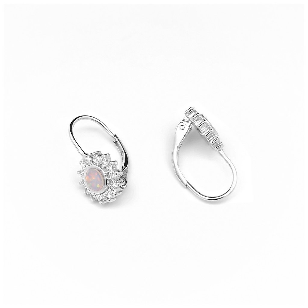 Strieborné bohato zdobené kamienkové náušnice, náušnice majú centrálny kameň opál o priemere 4mm, po bokoch je zdobený bielymi zirkónmi. Priemer ozdoby je 8mm. Zapínanie je na patent. Náušnice majú povrchovú úpravu rodium.