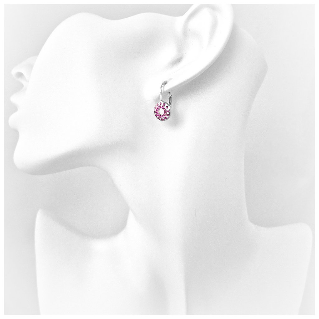 Strieborné bohato zdobené kamienkové náušnice - tmavšie ružové. Priemer ozdoby je 8mm. Zapínanie je na patent. Náušnice majú povrchovú úpravu rodium.