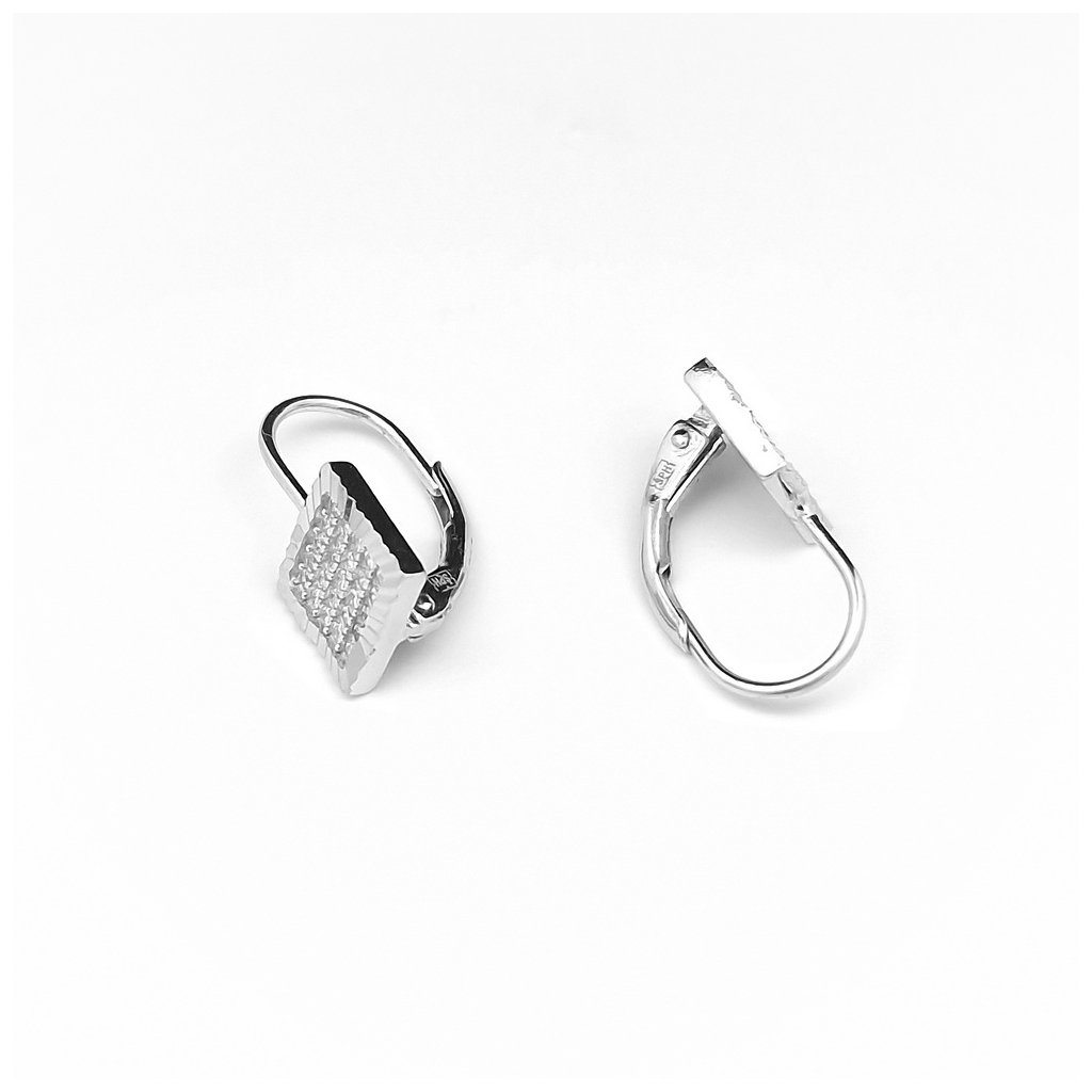Strieborné bohato zdobené kamienkové náušnice, náušnice majú ozdobu v tvare štvorca s rozmerom 7x7mm, po obvode je mierne gravírovaná. Zapínanie je na patent. Náušnice majú povrchovú úpravu rodium.