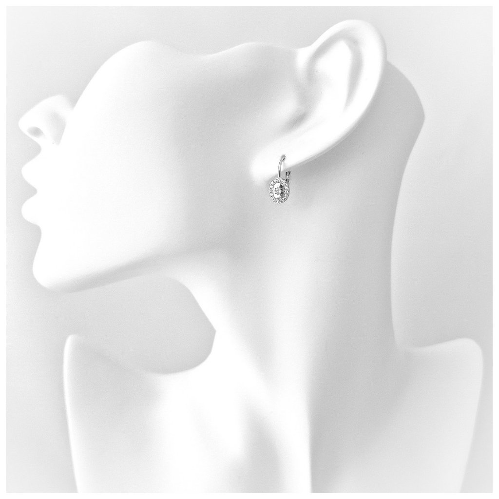 Strieborné náušnice zdobené zirkónmi. Centrálny kameň je osadený v oválnej ozdobe, dookola zdobený brusom a zirkónmi, rozmer ozdoby je 8x6mm. Zapínanie je na patent. Náušnice majú povrchovú úpravu rodium.