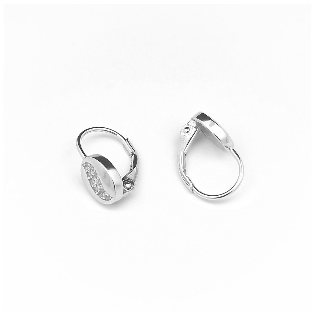 Strieborné náušnice zdobené zirkónmi. Ozdoba je v tvare oválu a je zdobená bielymi zirkónmi. Rozmer ozdoby je 8x6mm. Zapínanie je na patent. Náušnice majú povrchovú úpravu rodium.