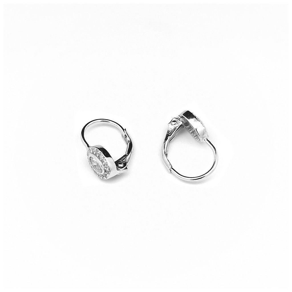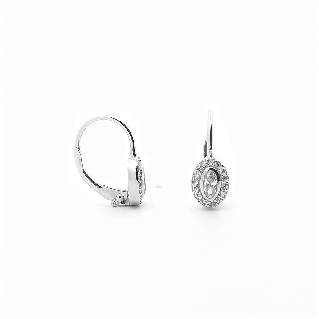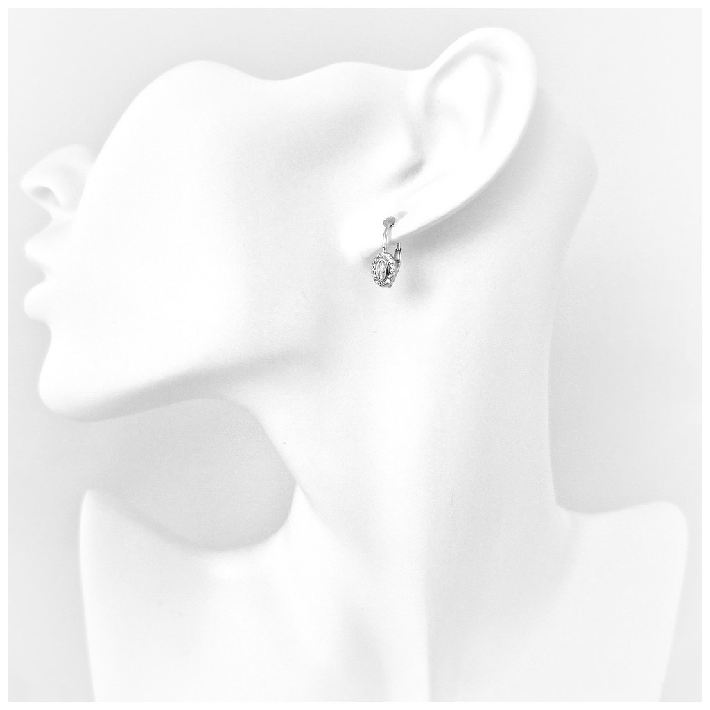 Strieborné náušnice zdobené zirkónmi. Centrálny kameň je v tvare oválu a v jemnej obrube, dookola je zdobený zirkónmi, rozmer ozdoby je 7x5mm. Zapínanie je na patent. Náušnice majú povrchovú úpravu rodium.