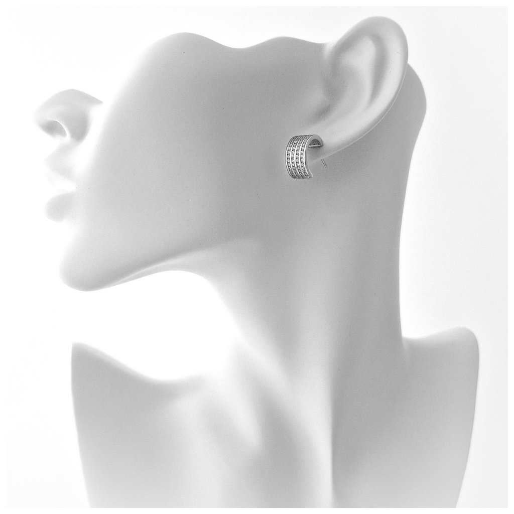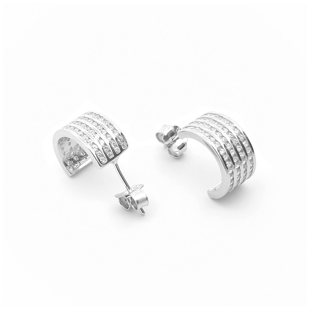 Dámske strieborné náušnice, hrubšie menšie polkruhy so zapínaním na puzetku, bohato zdobené bielymi zirkónmi. Vnútorný priemer náušnice je 10,00mm. Hrúbka je 7,00mm. Náušnice majú povrchovú úpravu rodium.