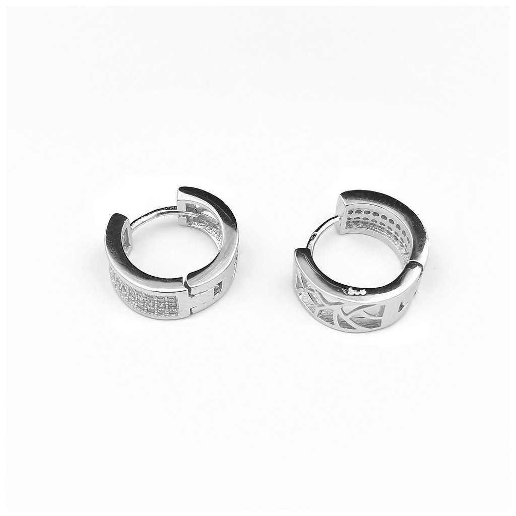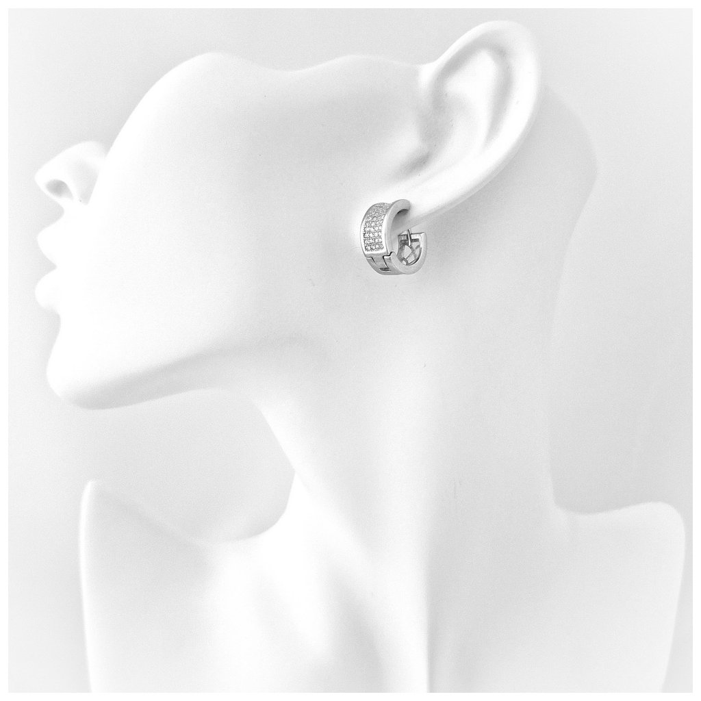 Strieborné náušnice - hrubšie kruhy so zirkónmi s vnútorným priemerom 12,00cm. Hrúbka náušnice je cca 6mm, z prednej strany sú bohato zdobené zirkónmi. Zapínanie je do seba na zacvaknutie.