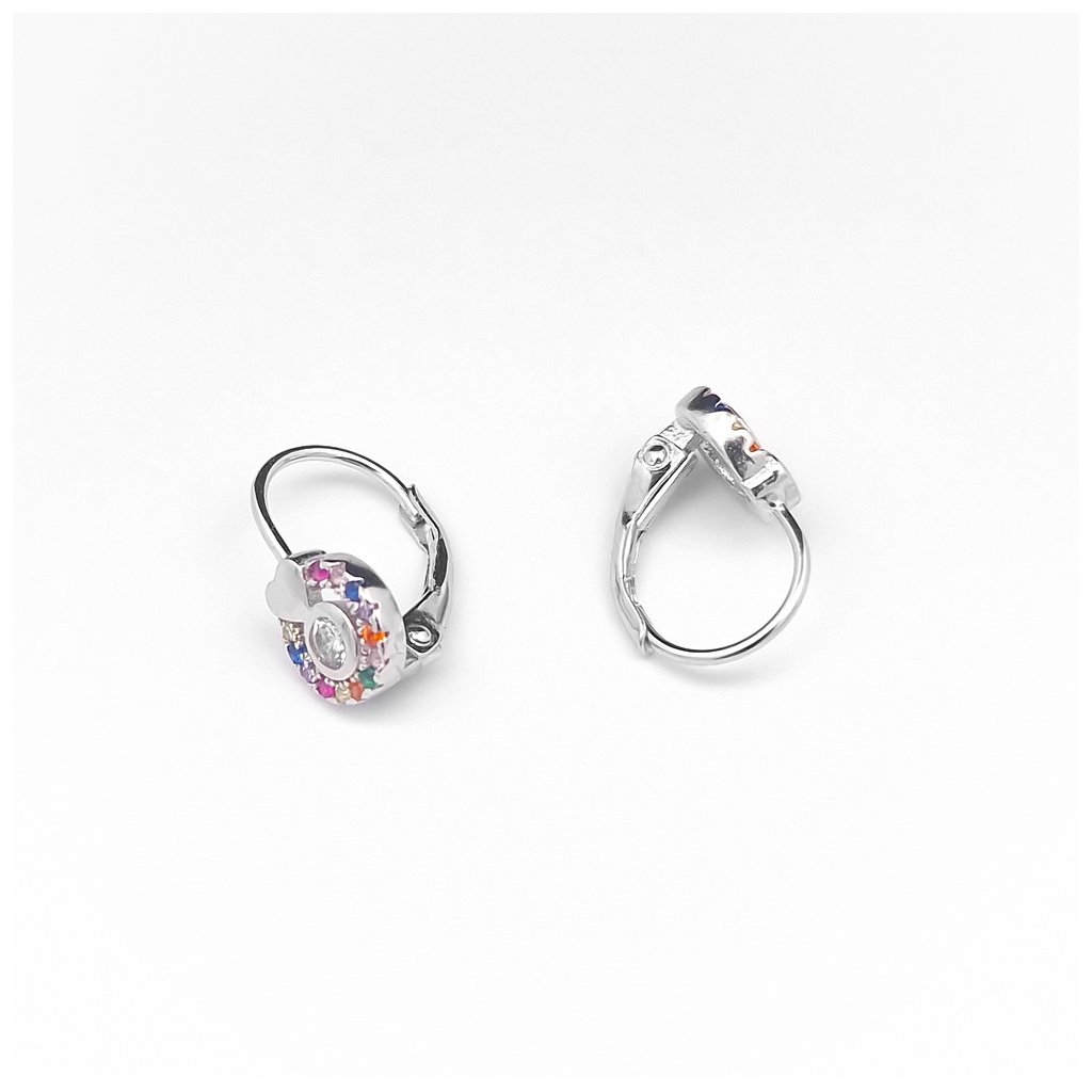 Strieborné náušnice ,,farebný mix". Tieto náušnice sú vhodné aj pre mladé slečny, zapínanie majú na patent. Sú bohato zdobené farebnými kamienkami a srdiečkom. Priemer ozdoby je cca 7mm.