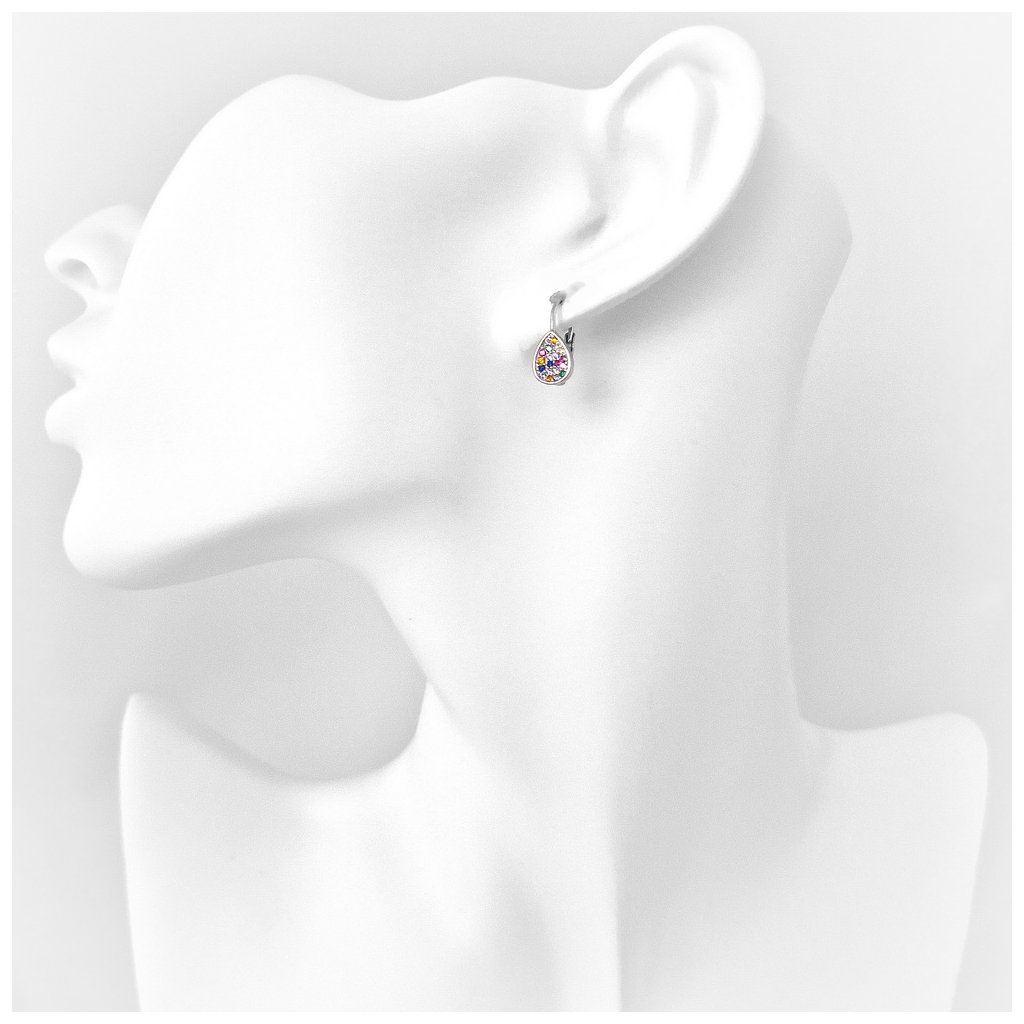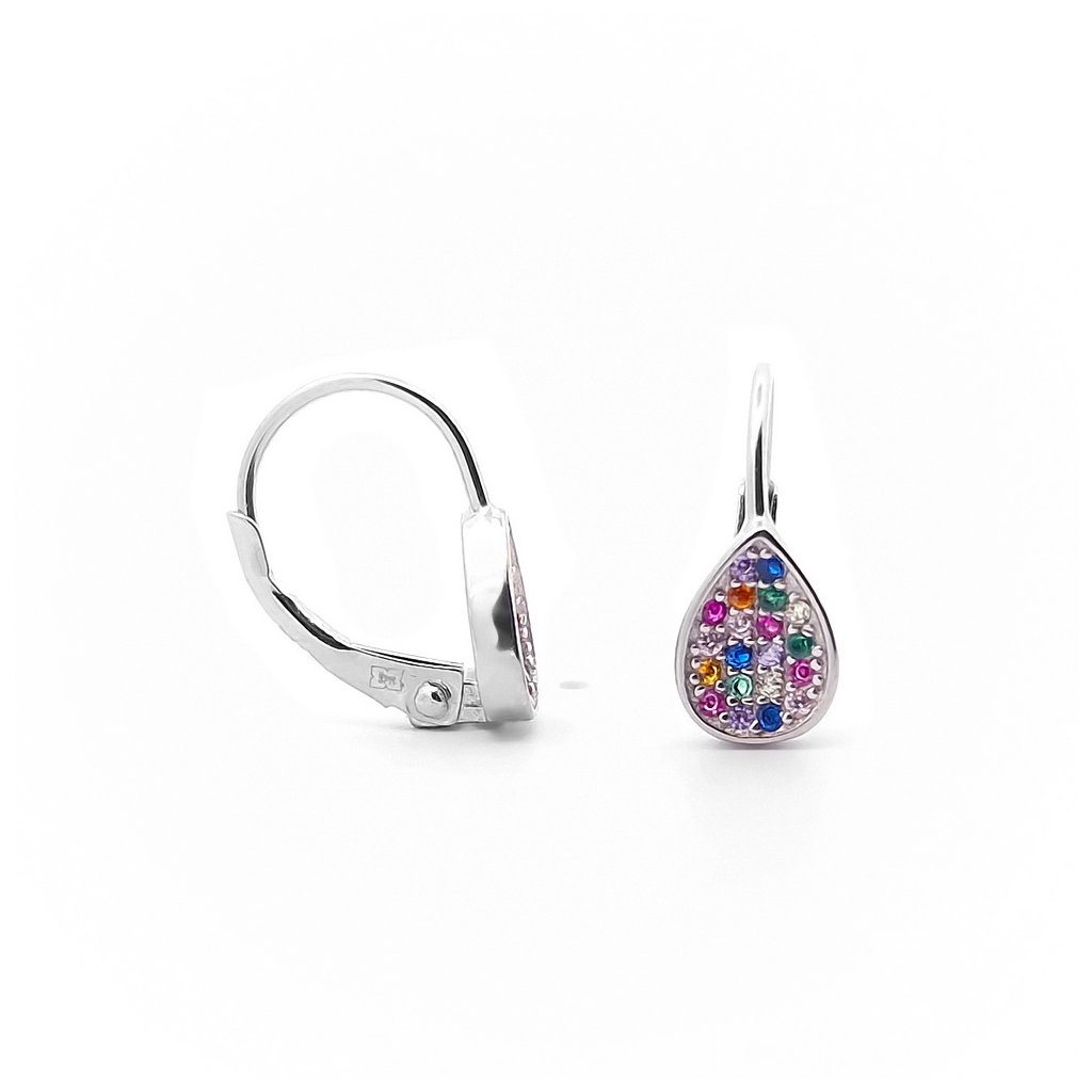 Strieborné náušnice ,,farebný mix". Tieto náušnice sú vhodné aj pre mladé slečny, zapínanie majú na patent. Sú bohato zdobené farebnými kamienkami. Ozdoba je v tvare slzy s rozmerom cca 7x5mm.