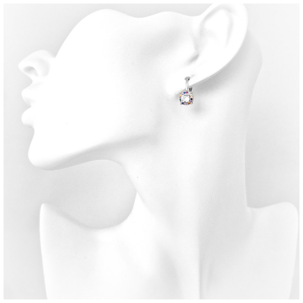 Strieborné náušnice - kamienkové, centrálny kameň je bielej farby s priemerom 4mm, dookola je zdobený farebnými kamienkami. Zapínanie majú na patent. Priemer ozdoby je 6mm.