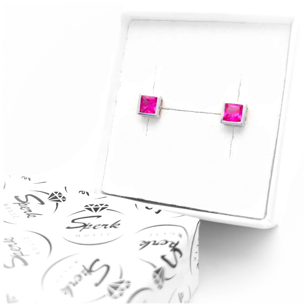 Dámske strieborné náušnice, ozdoba je v tvare štvorca, centrálny kameň je tmavo ružovej farby. Rozmer kamienka je 4x4mm. Zapínanie na buzetku.