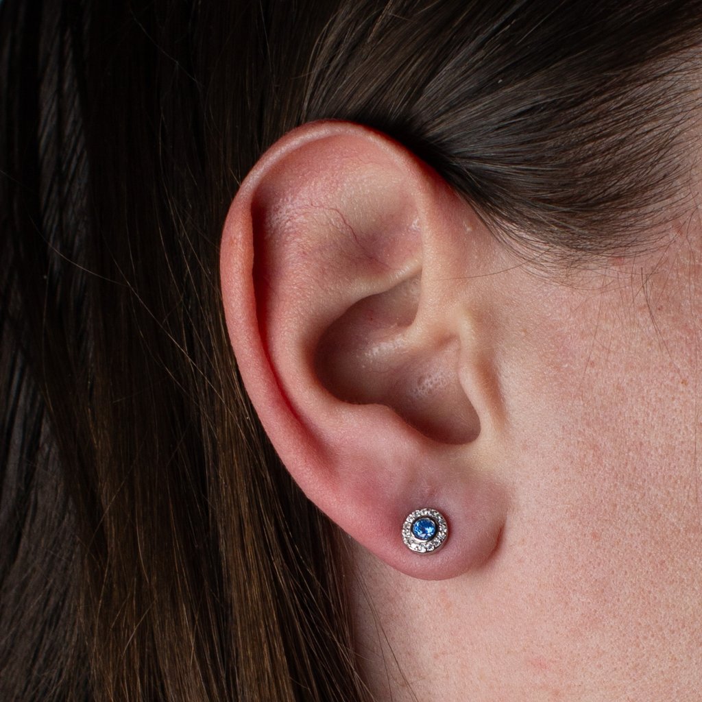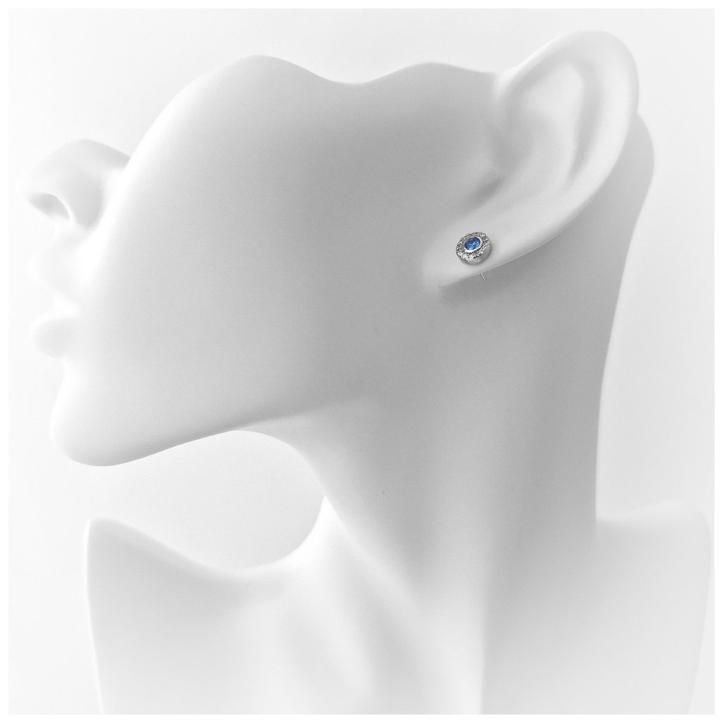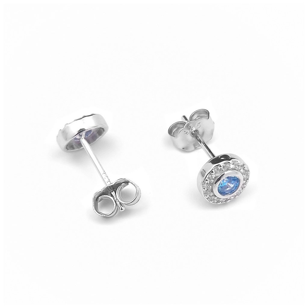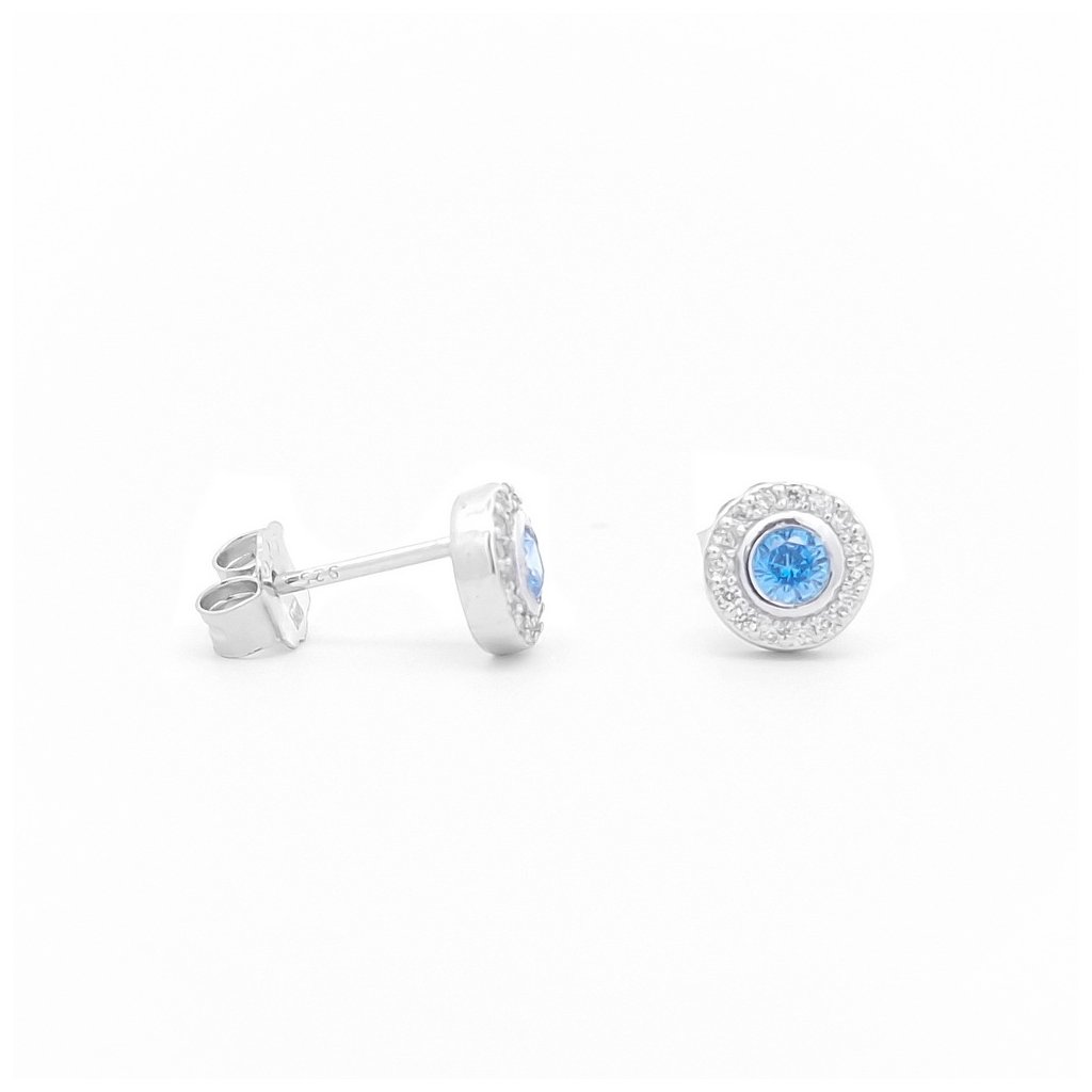 Dámske strieborné náušnice s bledo modrým očkom s priemerom 3mm, dookola je bohato zdobený bielymi zirkónmi. Celkový priemer ozdoby je 7mm. Zapínanie je na buzetku.