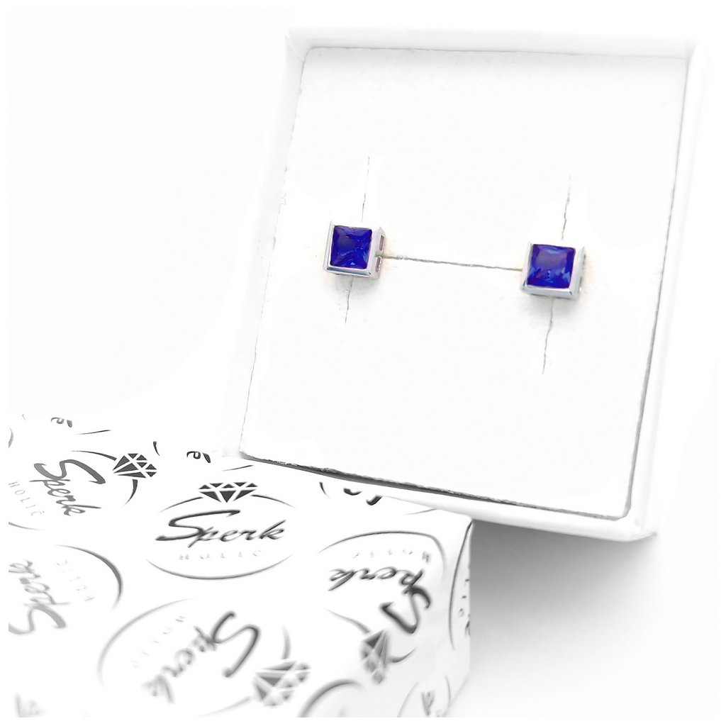 Dámske strieborné náušnice, ozdoba je v tvare štvorca, centrálny kameň je tmavo modrej farby. Rozmer kamienka je 4x4mm. Zapínanie na buzetku.