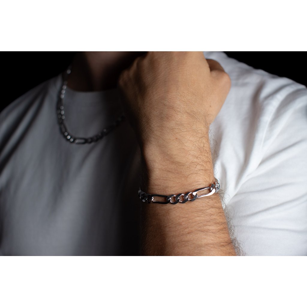 Strieborný náramok vzor figaro 3+1. Šírka je 7,50mm. Zapínanie na karabinku. Tento model náramku má povrchovú úpravu rodium.