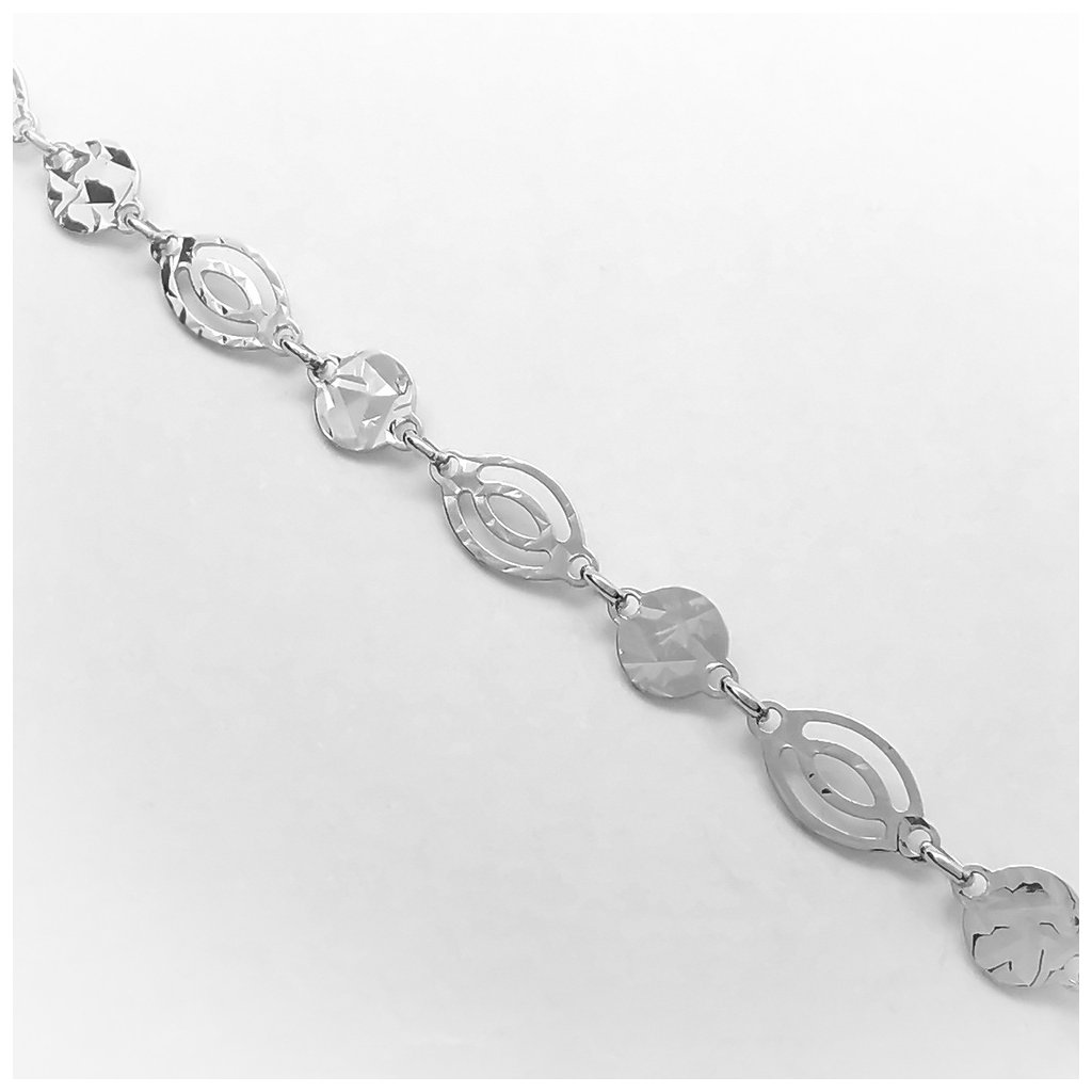 Strieborný náramok vhodný ako dámsky, zložený je z gravírovaných a perforovaných platničiek. Šírka platničiek je cca 4,00mm. Zapínanie je na perový krúžok. Tento model šperku má povrchovú úpravu rodium.