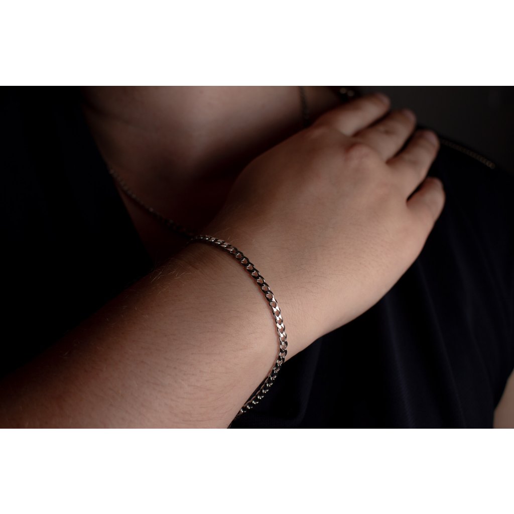 Strieborný náramok vhodná pre každého. Typ pancier. Šírka cca 3,50 mm. Tento model má povrchovú úpravu rodium. Zapínanie je na karabinku