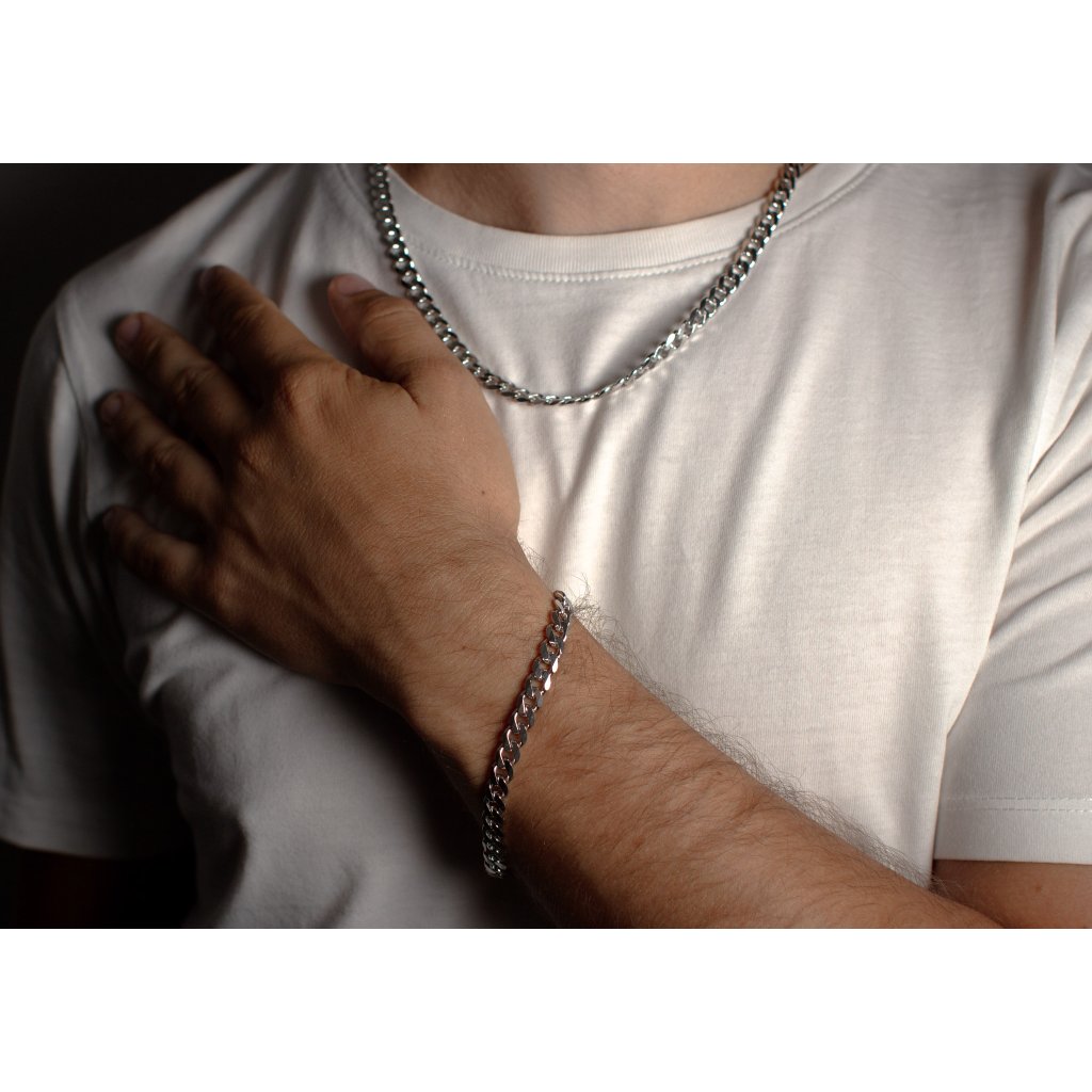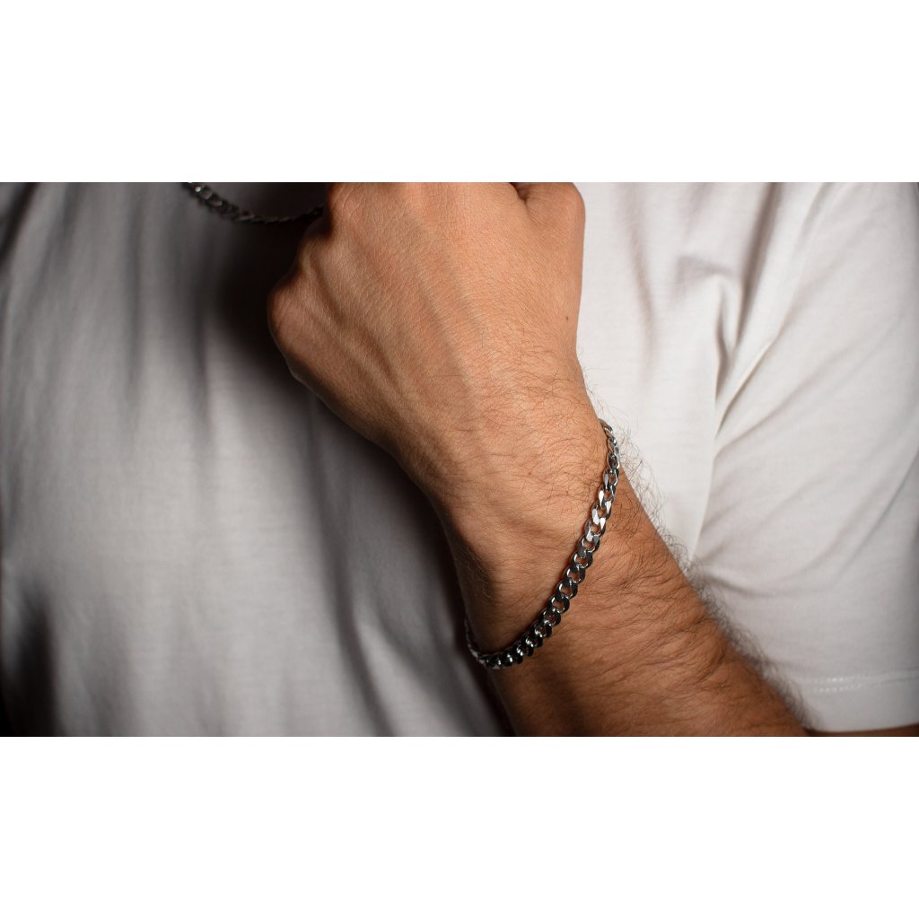 Strieborný náramok vhodný pre každého. Typ pancier. Šírka cca 6,50 mm. Zapínanie je na karabinku. Tento model náramku má povrchovú úpravu rodium.