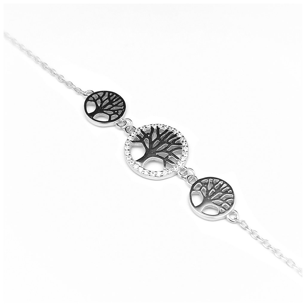 Strieborný náramok s ozdobou „strom života“. Priemer strednej ozdoby je 12,00mm, po obvode má kamienky, ozdoby po bokoch majú priemer 8,00mm. Zapínanie je na karabinku. Náramok má povrchovú úpravu rodium.