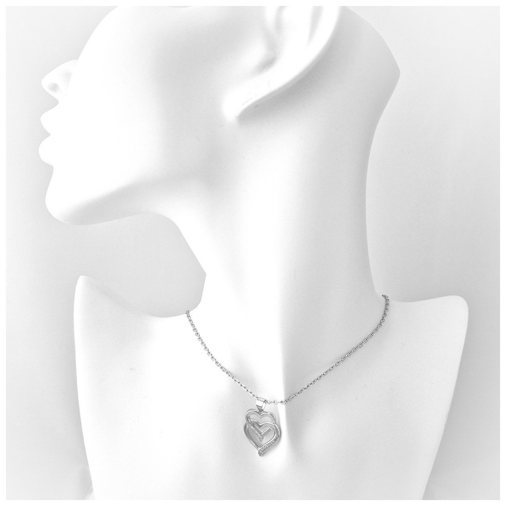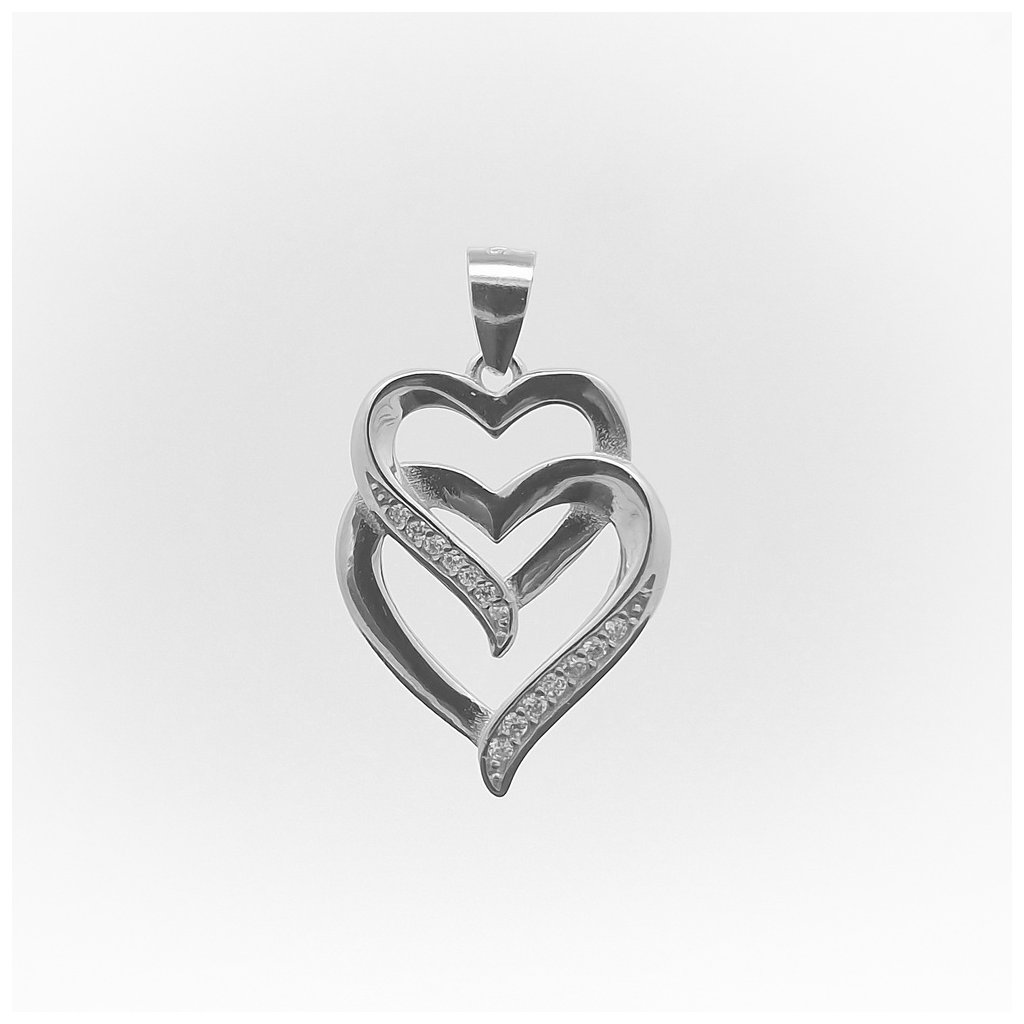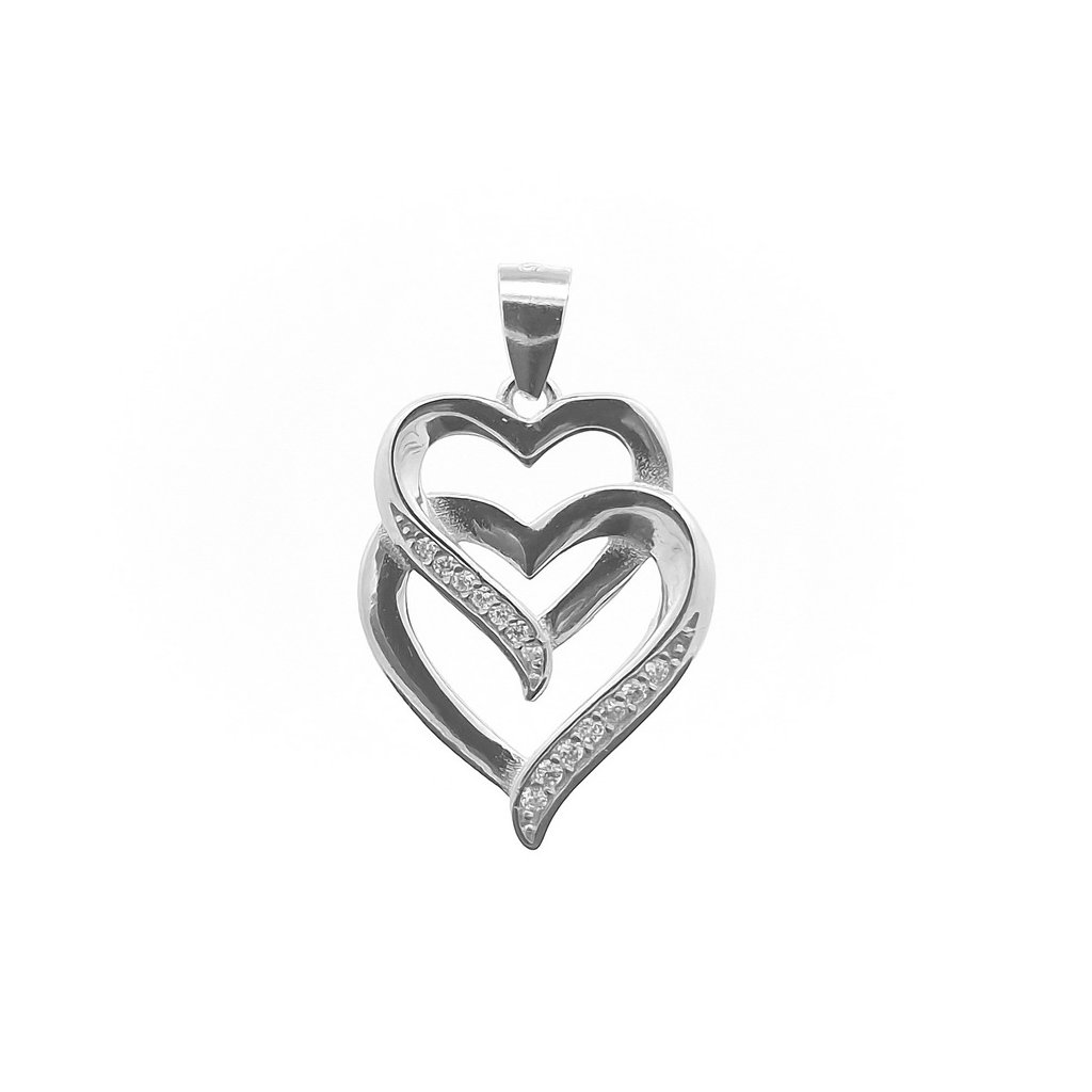 Strieborný prívesok dvojité srdiečko s kamienkom. Prívesok je zdobený bielymi zirkónmi. Rozmer prívesku je cca 20x15mm. Rozmer závesného uška je 5x4mm. Tento model má povrchovú úpravu rodium.