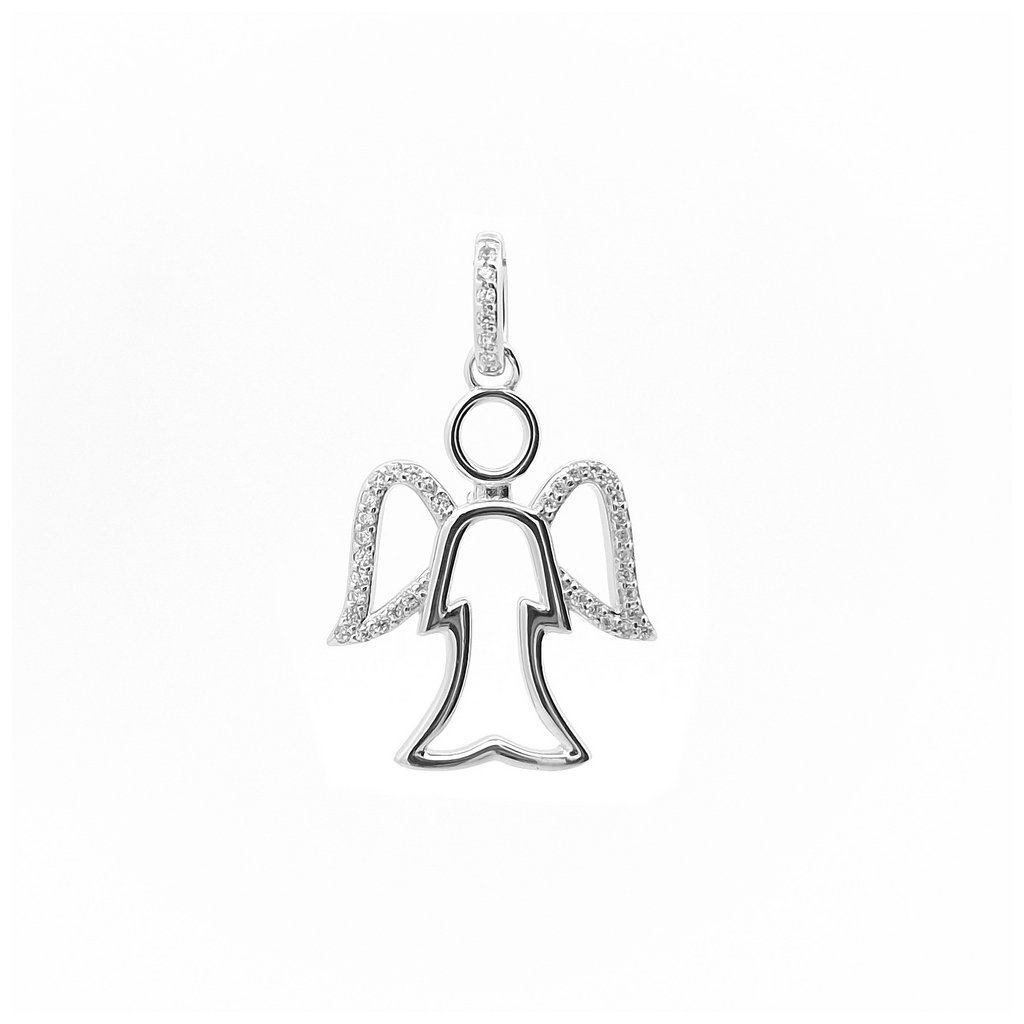 Strieborný prívesok ,,kamienkový anjel" Rozmer prívesku je cca 15x20mm. Rozmer závesného uška je 5x4mm. Prívesok aj závesné uško je zdobené bielymi zirkónmi. Prívesok má povrchovú úpravu rodium.