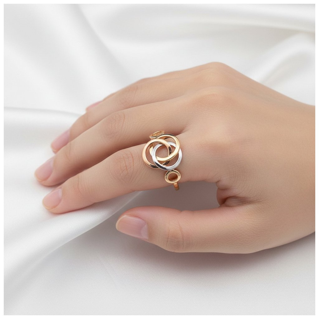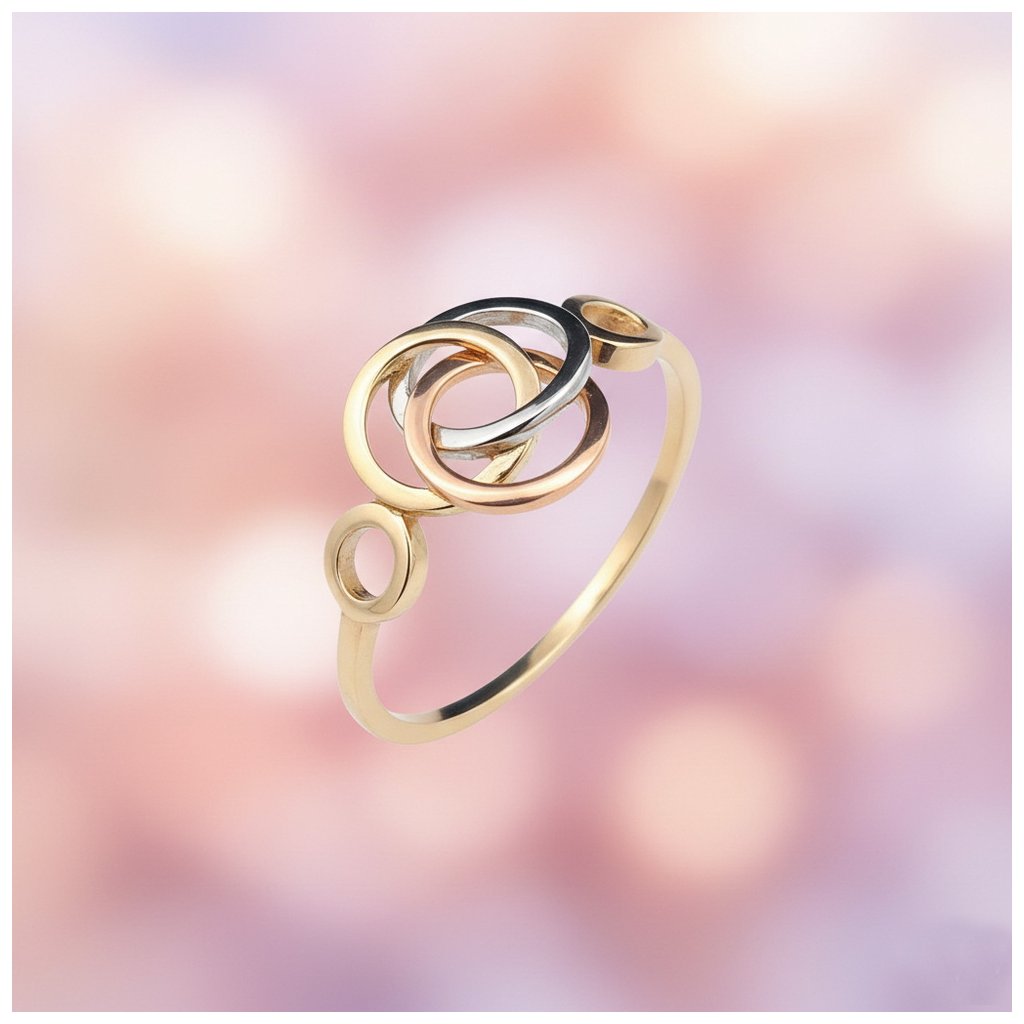 Trojfarebný prepletený zlatý prsteň. Ozdoba je zo žltého bieleho a ružového zlata. Šírka ozdoby z vrchnej strany je cca 10mm. Prsteň je vo veľkosti 50. Obsahuje 1,30gr., 14Kt.