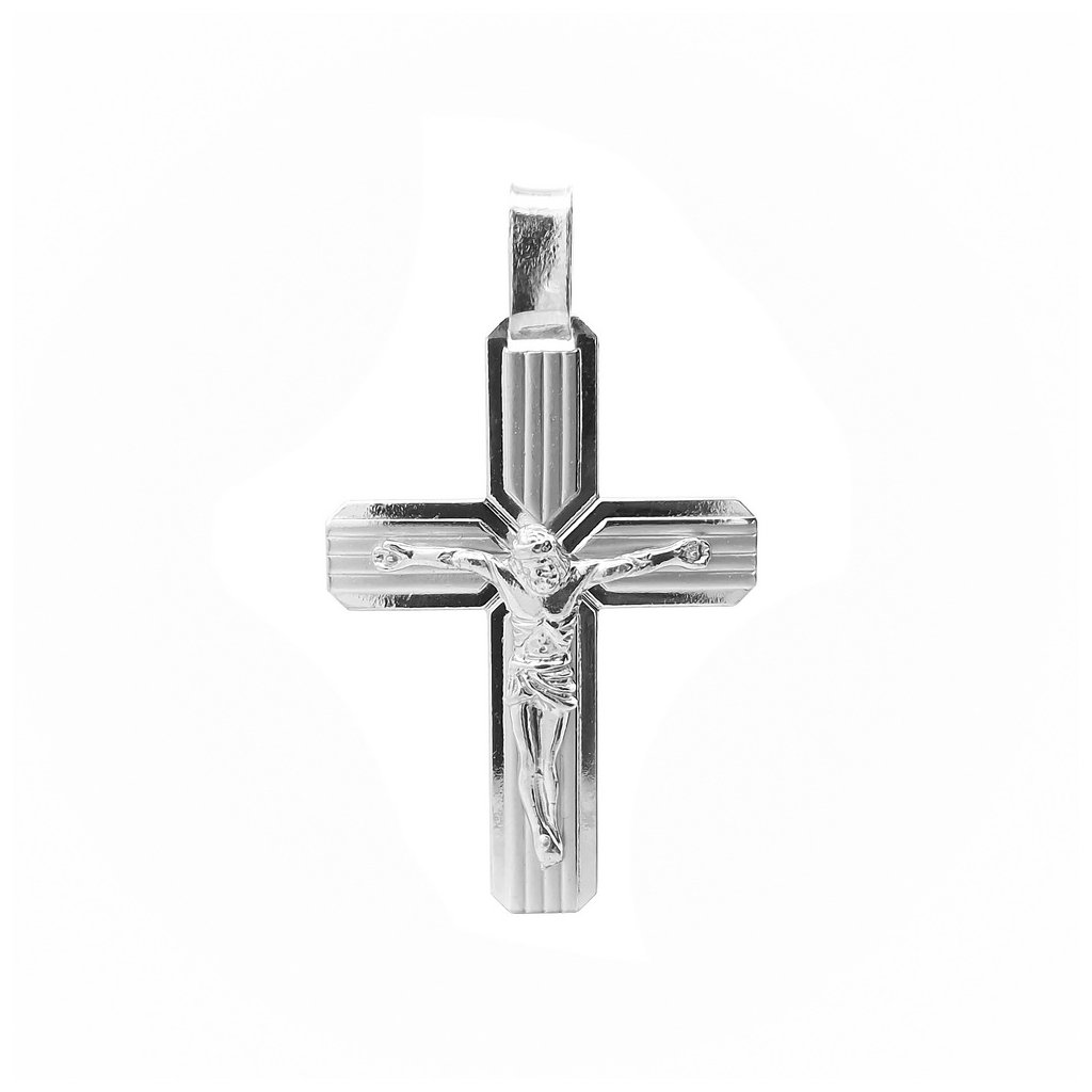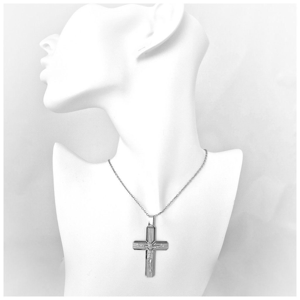 Väčší strieborný prívesok ,,krížik s Kristom". Rozmer prívesku je 40x30x8mm. Rozmer závesného uška je 10x5mm. Prívesok má povrchovú úpravu rodium.