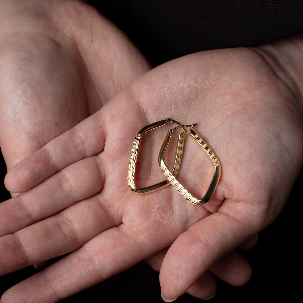 Zlaté dámske náušnice v tvare lichobežníka. Náušnica je mierne gravírovaná s rozmerom cca 25x30mm, z prednej strany majú hrúbku cca 3mm. Zapínajú sa do vidličky.