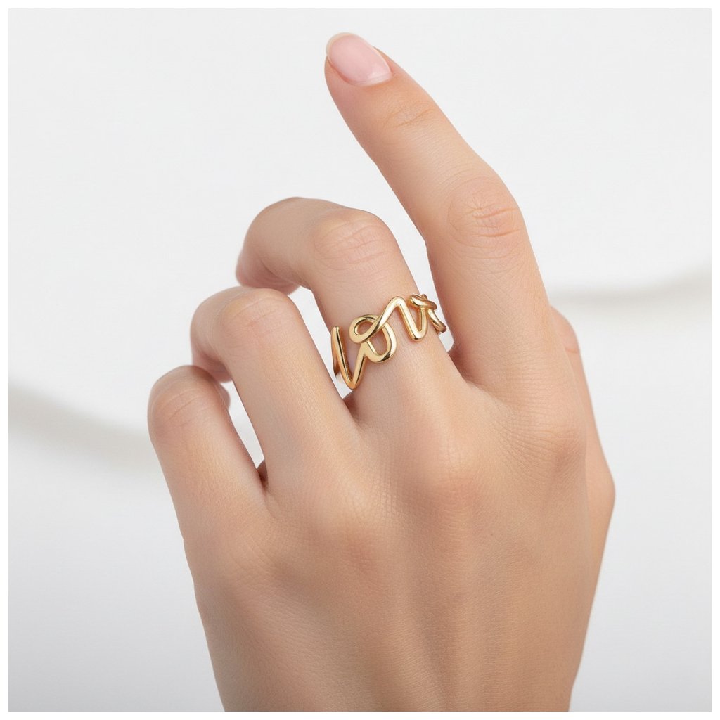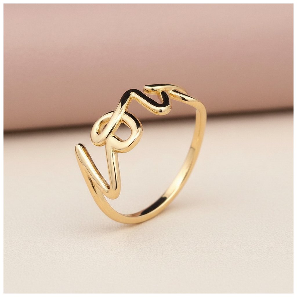 Prsteň zo žltého zlata s nápisom LOVE. Vrchná ozdoba má rozmer cca 7x20mm.