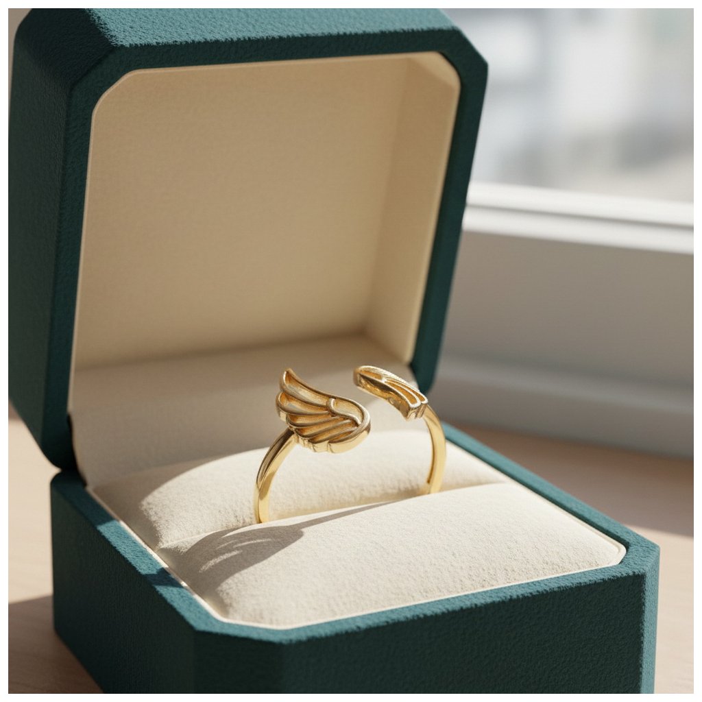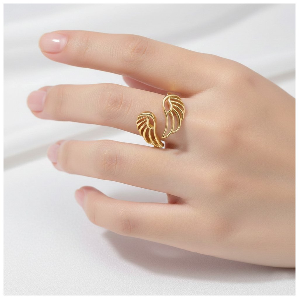 Prsteň zo žltého zlata anjelské krídla bez kamienkov. Vrchná ozdoba má rozmer cca 15x15mm. Prsteň má variabilnú veľkosť, nakoľko z vrchnej časti nie je zletovaný.