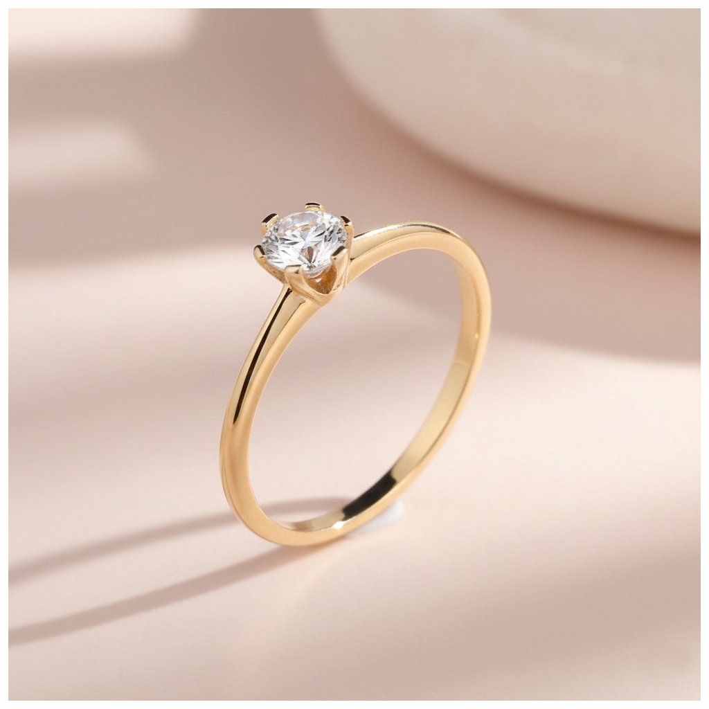 Prsteň zo žltého zlata vhodný ako zásnubný s bielym zirkónom. Priemer kameňa je 4mm a je osadený v šiestich krapniach. Prsteň je vo veľkosti 54. Obsahuje až 1,45 g, 14k zlata.